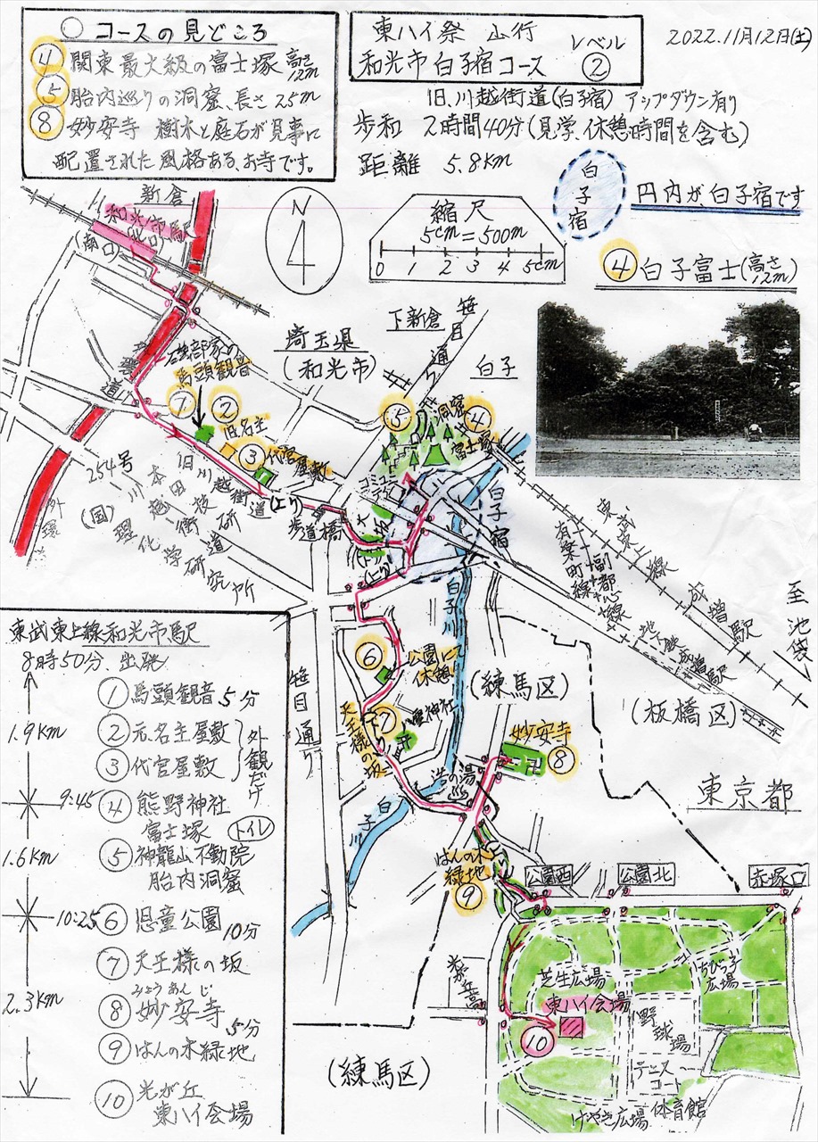 ▼コース : 和光市駅8:50 → 馬頭観音 → 元名主屋敷 一 代官屋敷 → 熊野神社(富士塚) → 神龍山不動院(胎内洞窟) → 児童公園 → 天王様の坂 → 妙安寺 → 11:10 光が丘東ハイ会場