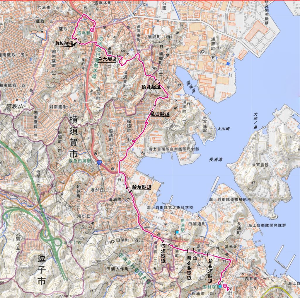 追浜駅10:20→向坂隧道10:32→平六トンネル10:49→筒井隧道11:02→梅田隧道11:17→