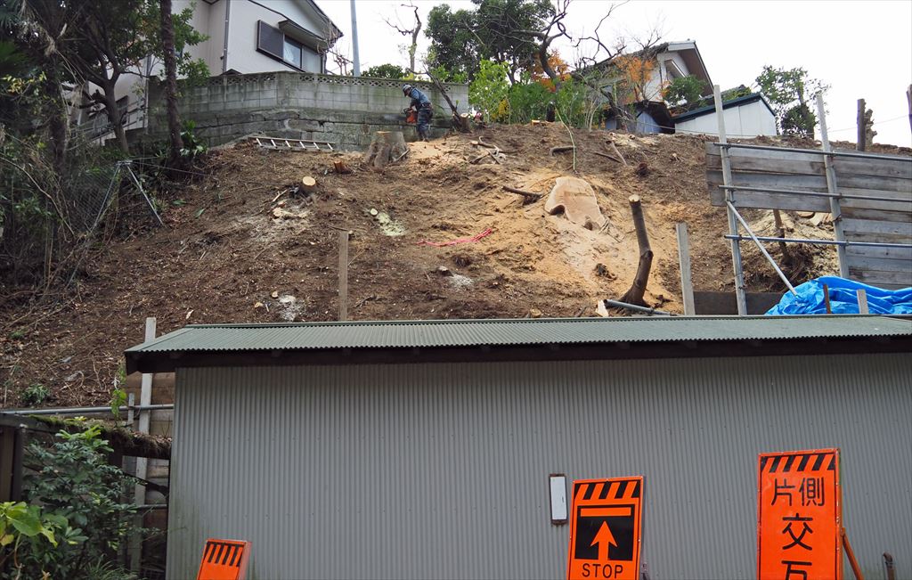 けたたましいチエンソーの音が聞こえてきた。樹木を伐採していた。たぶん、擁壁工事?