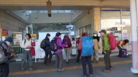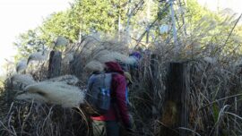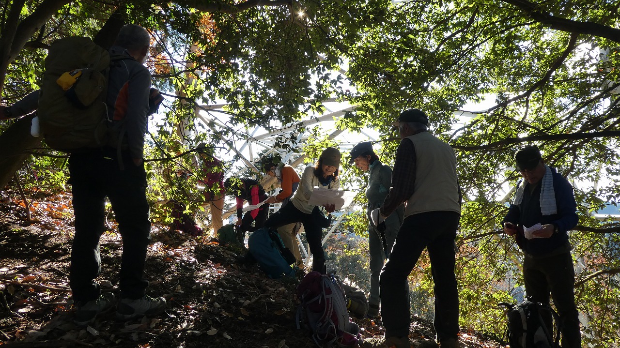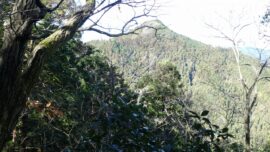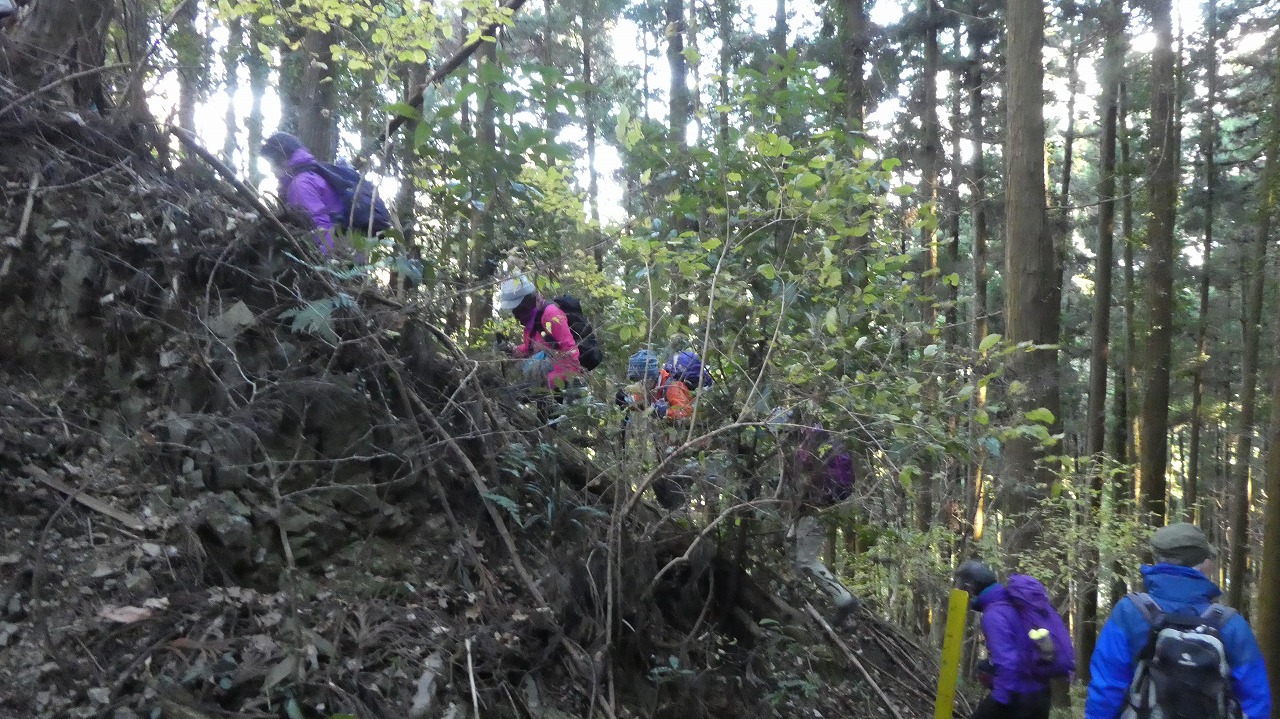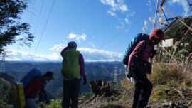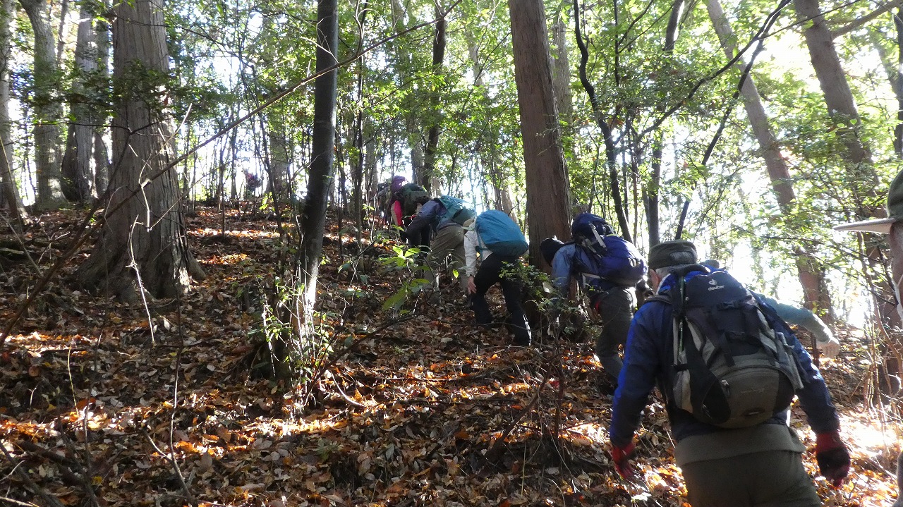 「取付きから主稜線までは南面の急登で暑かったが、その先はこの冬一番が実感できる寒さとなった。寒い大高山での昼食後は懸念していたヤブのルートが始まる。9月の時のすっぽりハマるヤブの中を搔き分け、もがいたルート探しの苦労が、ウソのようなススキの枯ざまに目を見張り、移り変わった季節に有り難さを思う。見通しも良く、おかげで当初の計画通りに歩くことが出来た。