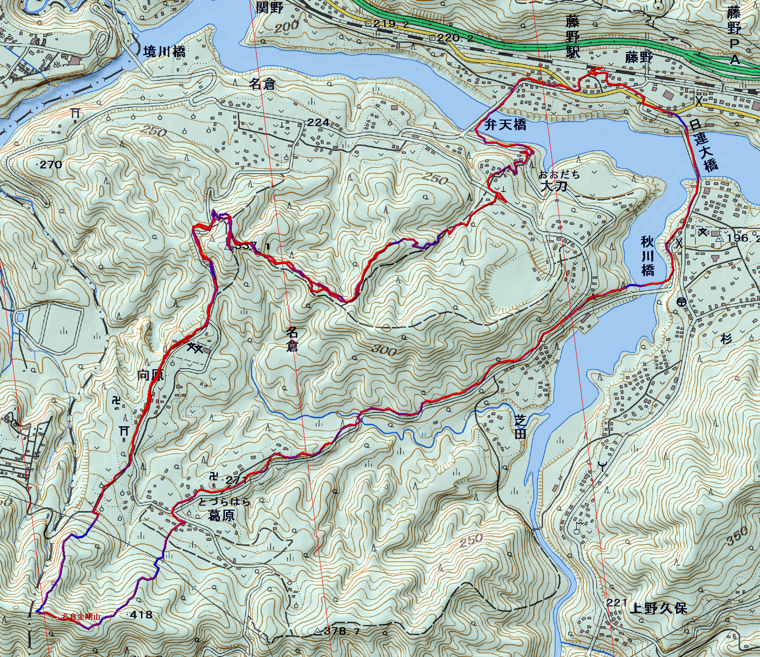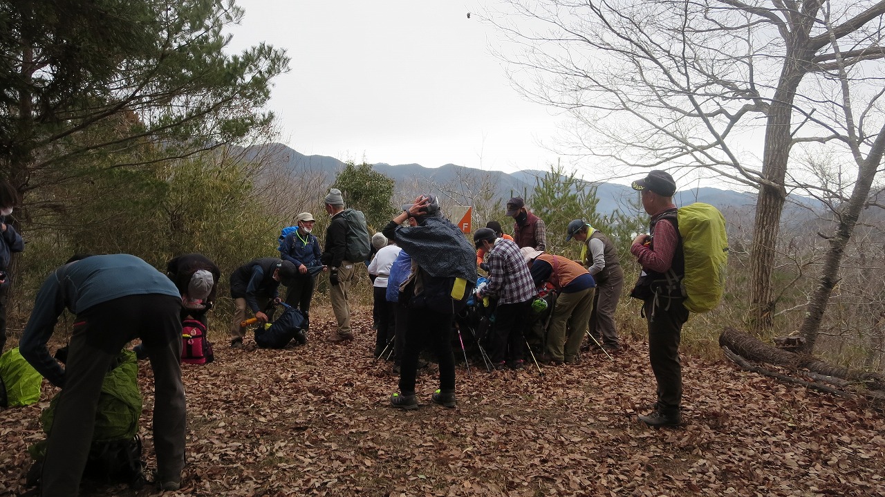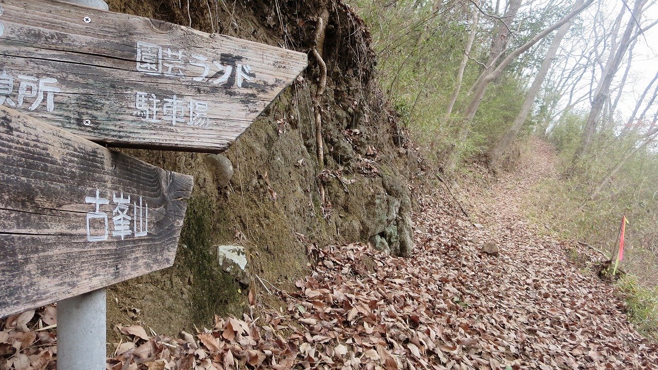 ▼藤野駅9時55分→古峯山10時45分~55分→一本松山11時5分~15分→名倉金剛山登山口(昼食)11時40分~12時15分→名倉金剛山12時25分→舗装道路13時→藤野駅14時=高尾駅