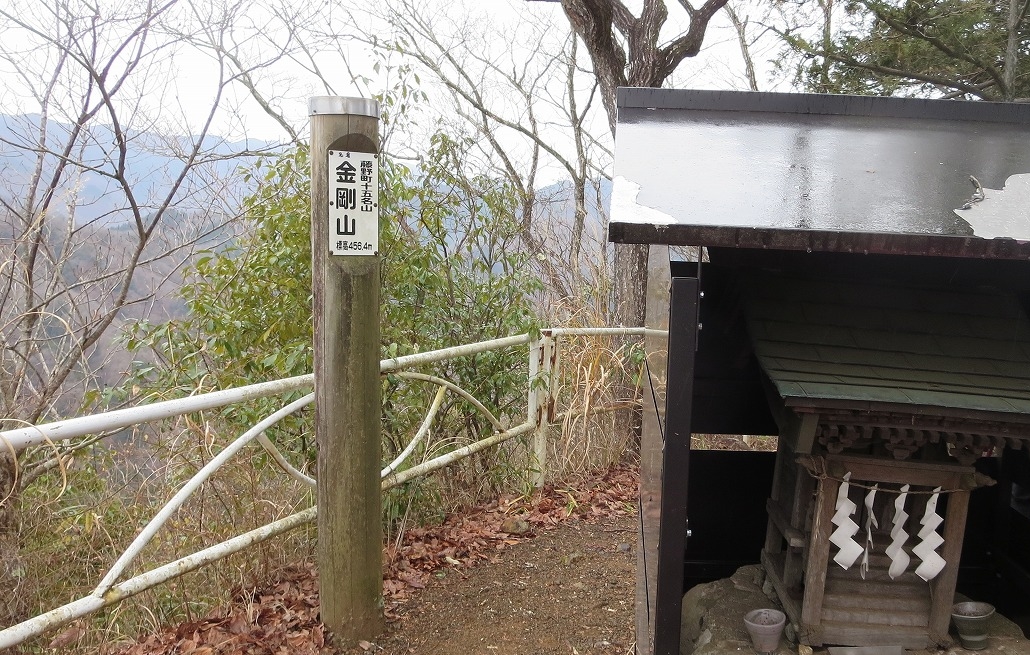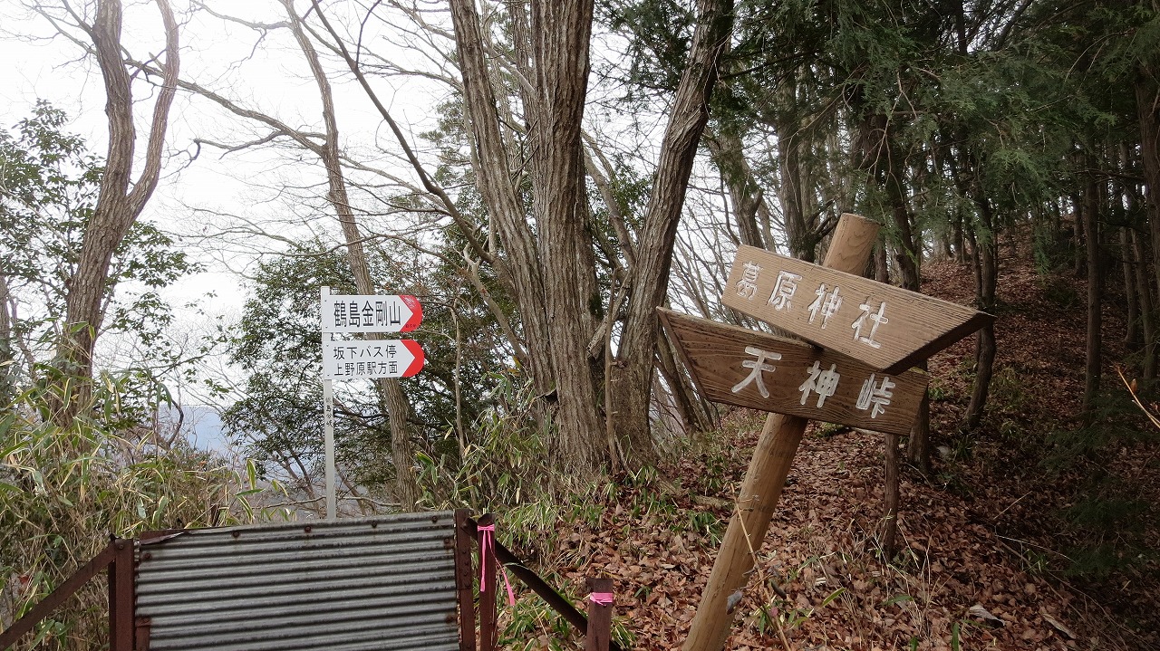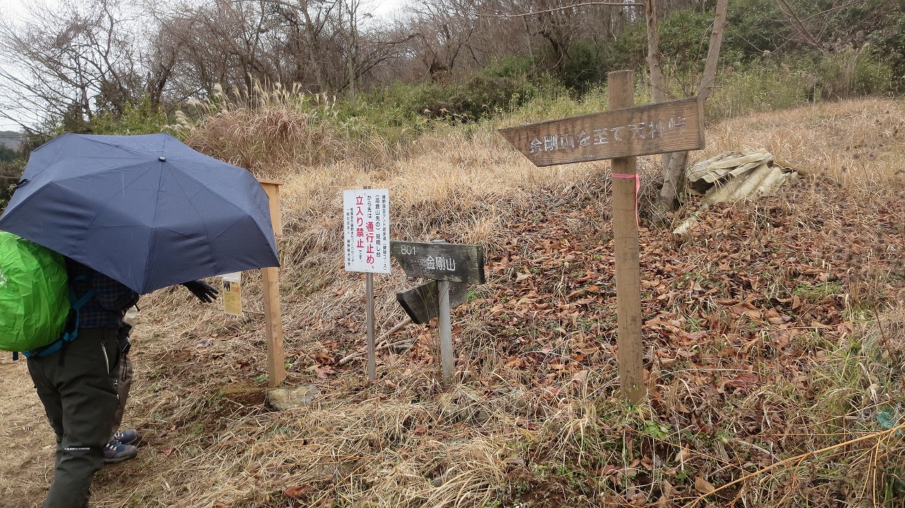 「葛原神社」を過ぎ「金剛山」取付点に、「(高倉山先の)見晴台から先は通行止め、立ち入りです」とある。