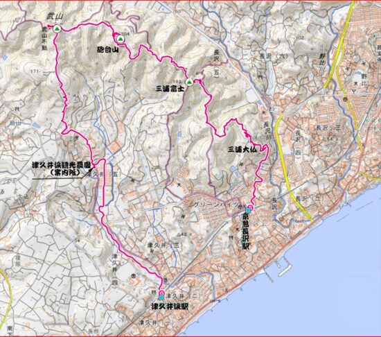 京急長沢駅9:55→10:15三浦大仏10:30→11:05三浦富士11:20→砲台山11:55