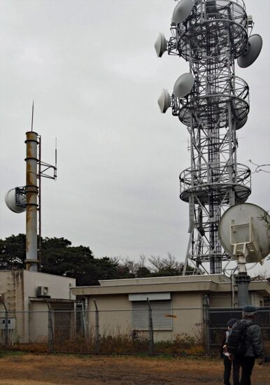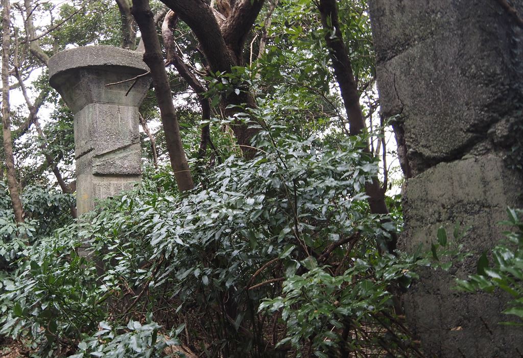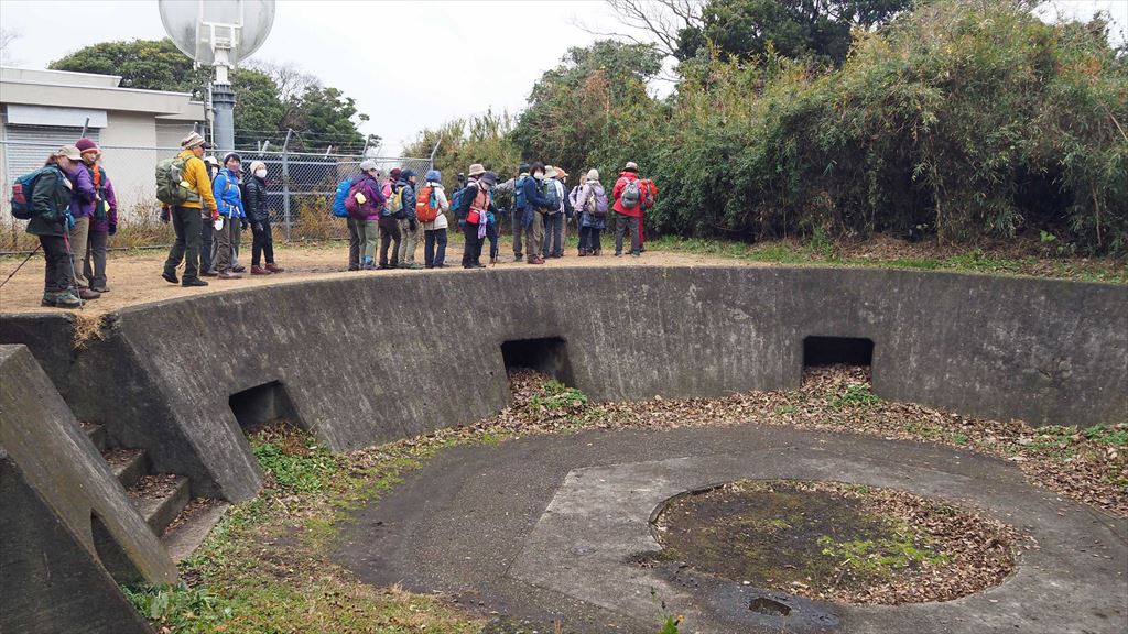 第二次世界大戦末期、海軍の砲台があったことから砲台山と呼ばれています。12.7cm高角砲2基、13.0mm連装機銃などが装備されていた。また、8個の四角い穴は弾薬の格納庫です。砲台跡の他にも兵舎や探照灯施設の遺構が藪の中に点在しています。現在、砲台跡の脇には海上保安庁の通信施設があります。