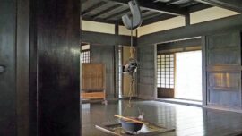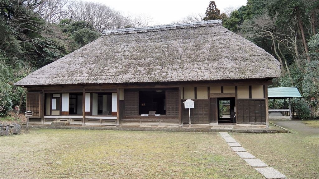 小池家は、新編風土記に表され、江戸時代には名主をつとめた柄沢の旧家です。移築された建物は天保12年(1841年)に棟上げされたもので、この年は水野忠邦による「天保の改革」が始まった年でもあります。桁行18.7m、梁間10.9m、建築面積52坪の寄棟造、茅葺屋根の風格ある建物です。