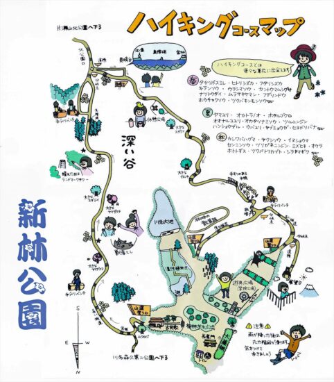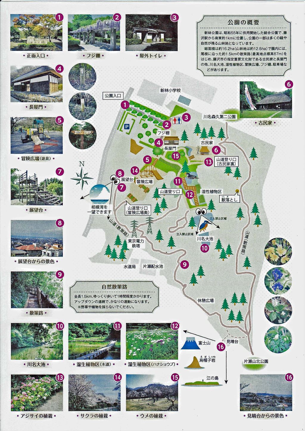 山林に囲まれた新林公園は、希少な植物が自生し、ホタルも生息するなど、緑と自然が多く残った公園です。 園内には、全長約1.5kmの散策路(ハイキングコース)、遊具のある冒険広場、湧き水でできた川名大池、藤沢市の指定重要文化財でもある古民家と長屋門などがあり、隣接する新林小学校を含めた新林公園周辺は、藤沢市の指定緊急避難場所(大規模火災)にも指定されています。 ハイキングコースではヤマユリやスミレなどの自生植物、川名大池ではカワセミやアオサギなどの野鳥、湿性植物区ではハナショウブやミソハギなどの湿生植物を季節により見ることができます。 また、藤沢市のフジの拠点としても位置づけられ、毎年4月下旬頃には多くのフジが開花します。 園内の清掃やハイキングコースの点検・整備、花壇管理などの作業は、公園美化推進団体「新林公園みどりの会」の方々が行っています。