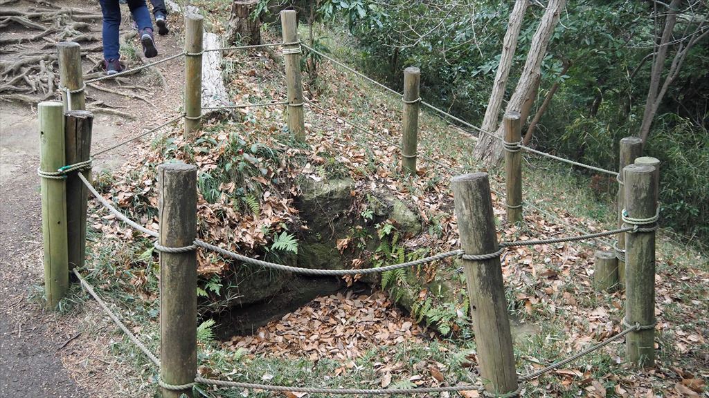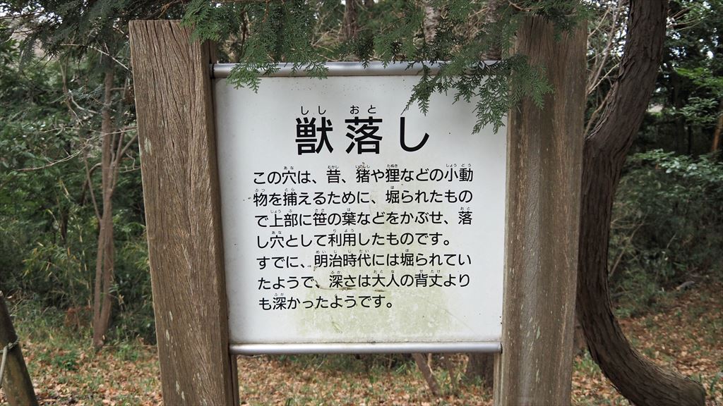 この穴は、昔、猪や狸などの小動物を捕らえるために掘られたもので上部に笹の葉などをかぶせ、落とし穴として利用したものです。明治時代に掘られていたようで、深さは大人の背丈より深かったようです。