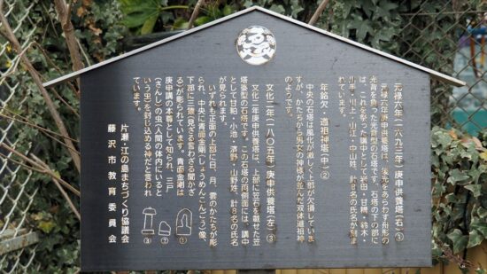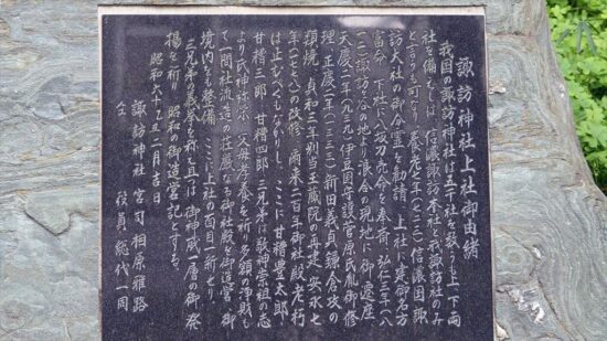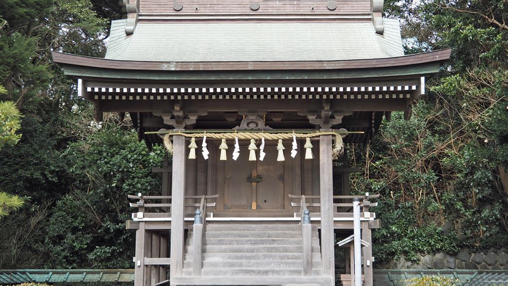 創建は養老7年(723)。信濃国諏訪大社からの御分霊を上、下社に祀ったことから始まりました。後に下社は宮畑から鯨骨に、上社は諏訪ケ谷から浪合に遷されました。元弘3年(1333)、新田義貞が鎌倉攻めをした時に焼失してしまいましたが、正平2年(1347)に社殿が再建されました。その後も改築され、現在も片瀬地区の氏神様として尊ばれています。