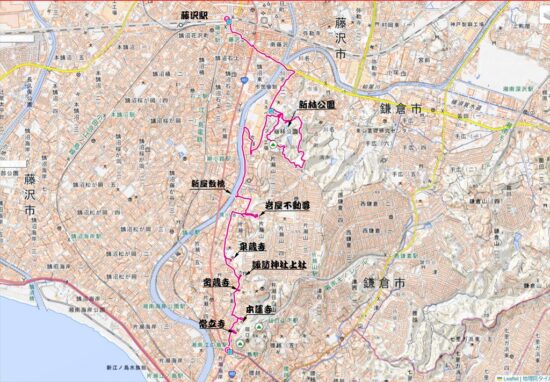 JR藤沢駅10:05→10:37新林公園(古民家等見学)→10:53ハイキングコース→新林公園(昼食)11:50~12:25→岩屋不動尊13:06→泉蔵寺13:33→諏訪神社上社13:45→蜜蔵寺13:53→本蓮寺14:00→常立寺14:15(解散)