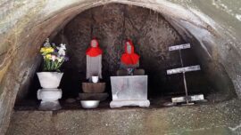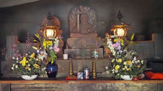 弘仁5年(814)、弘法大師がここに岩窟を掘り修行をしたといわれています。その後、快祐上人が石籠山救法教寺を開き、延亨元年(1744)、ここで即身成仏したと伝えられています。岩窟内は6畳程の広さで火焔を背負った不動尊が祀られています。毎年1月28日の初不動には、多くの参拝客で賑わいます