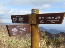 ▽ コース :バス停9:6→9:19景信山登山口→10:26景信山→11:13小仏峠→11:36小仏城山(昼食)12:13→一丁平13:10→もみじ台→14:40清滝駅(解散)