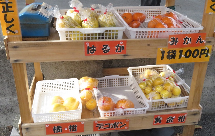 ミカンだけでなく、甘夏、イヨカン、ハッサク、キンカン、デコポン、湘南ゴールドなどなど いろいろなものが格安で売られていました