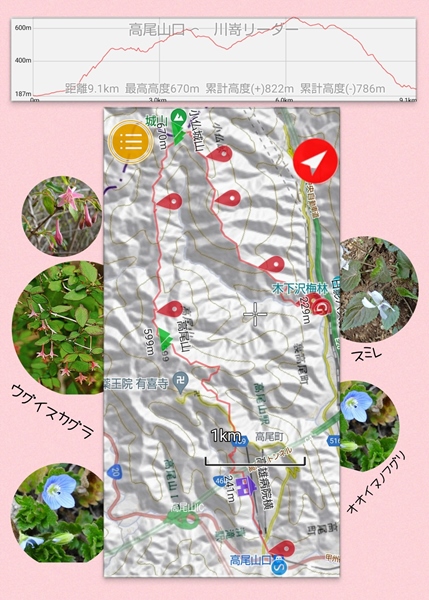 コ ー ス :駅9:30→高尾病院→琵琶滝分岐→浄心門10:30→4号路→山頂11:30→もみじ台11:40~12:15→城山13:20→北東尾根→日影沢→日影バス停14:40=高尾駅