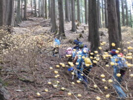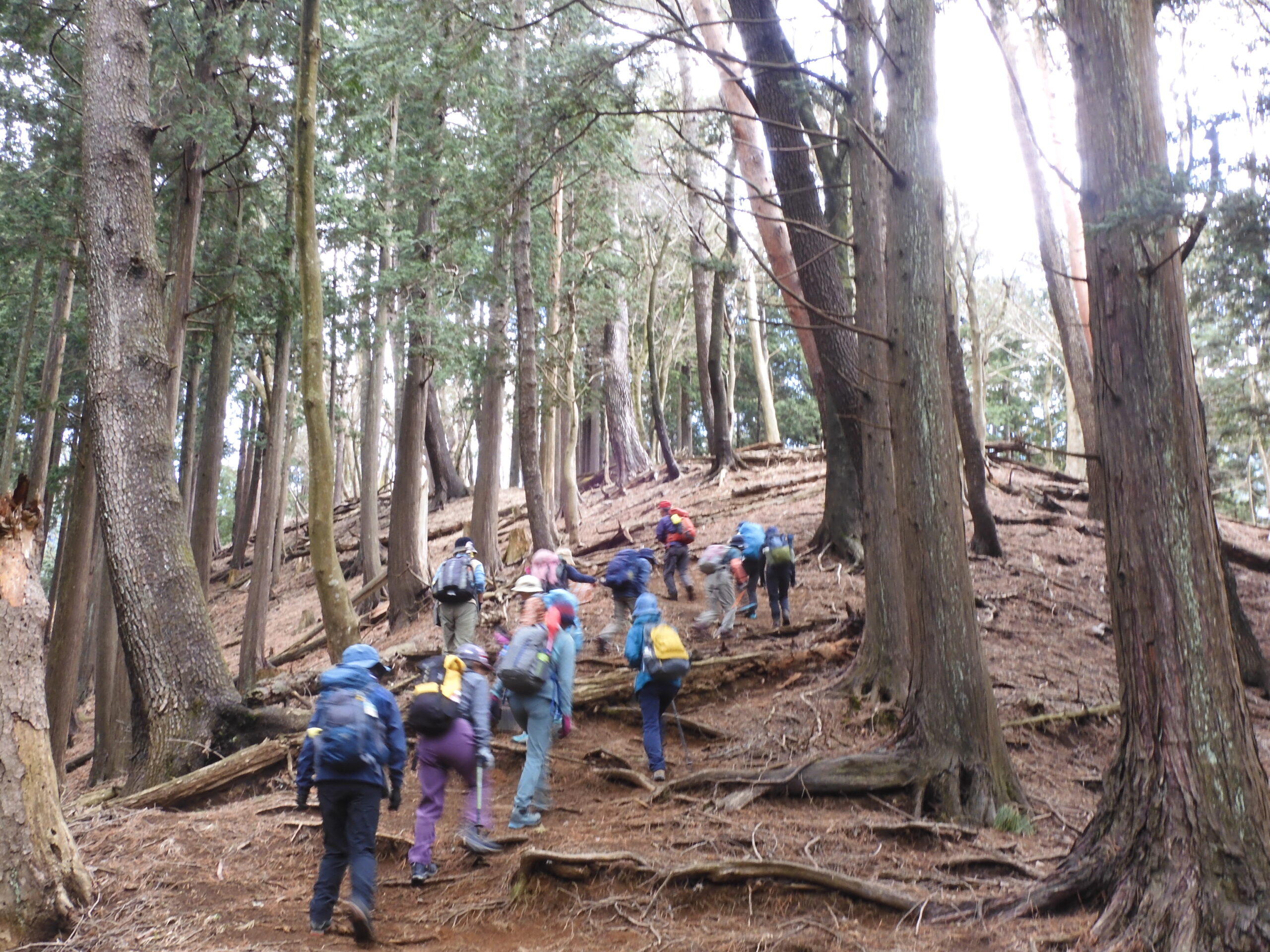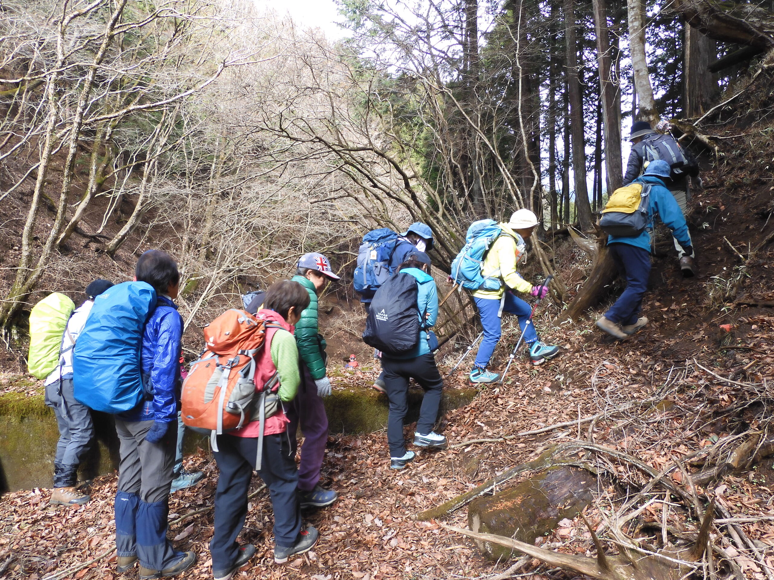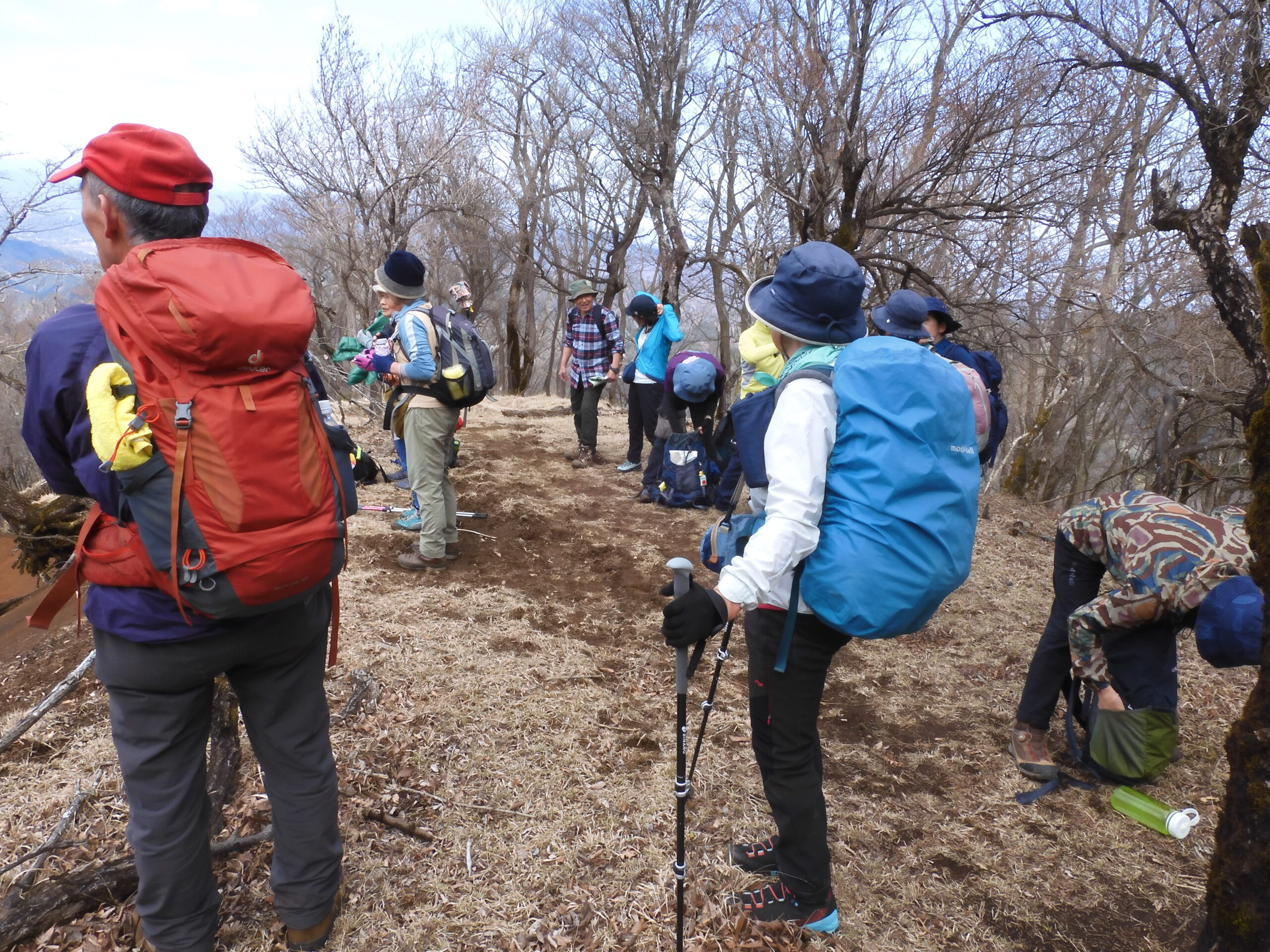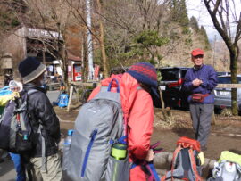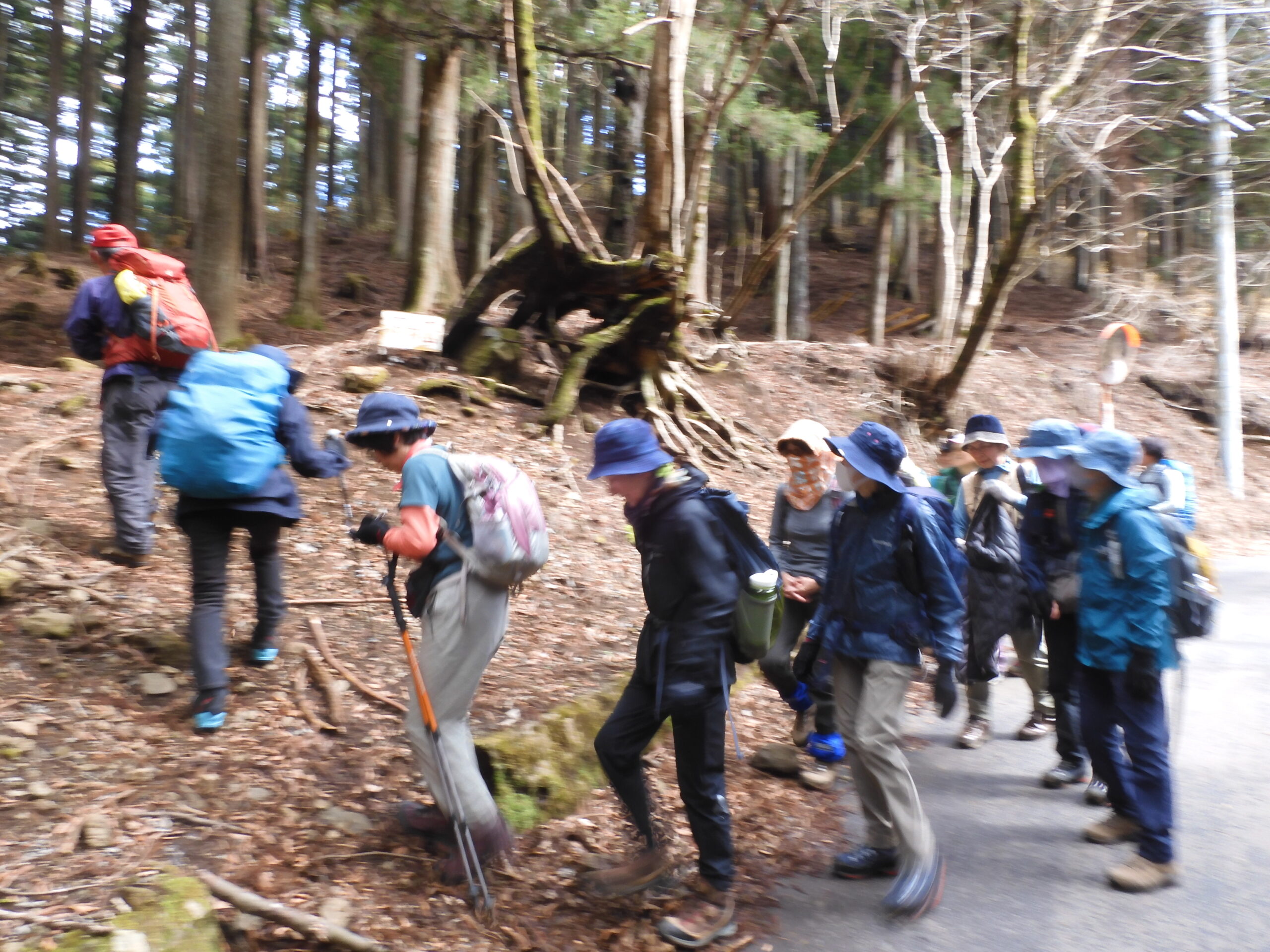 ヤビツ峠バス停 リーダー挨拶 コース説明して出発 コースは先日の雨で足元がスベル❕