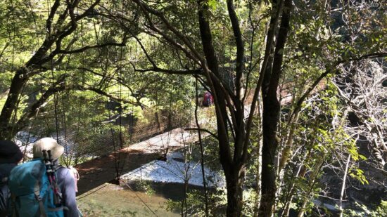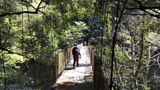 「桂川」の架かる錆びた古い吊り橋を恐る恐る渡ります。 10m以上間隔をあけてゆっくりと!