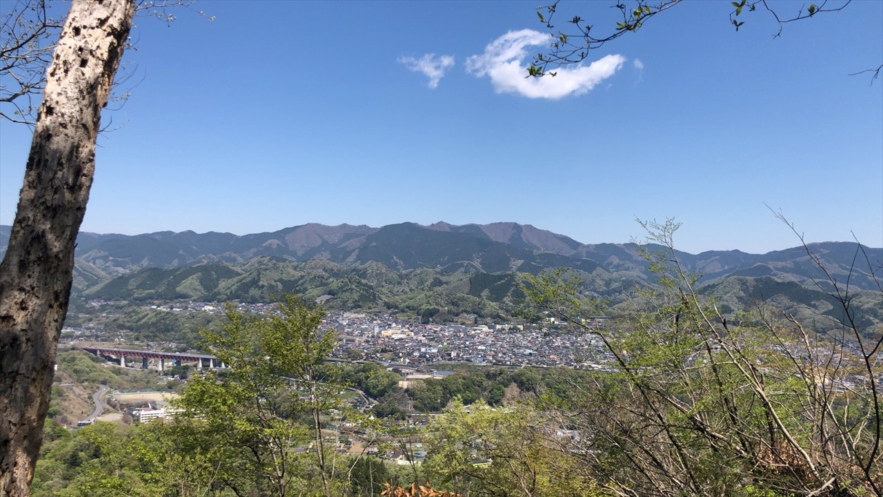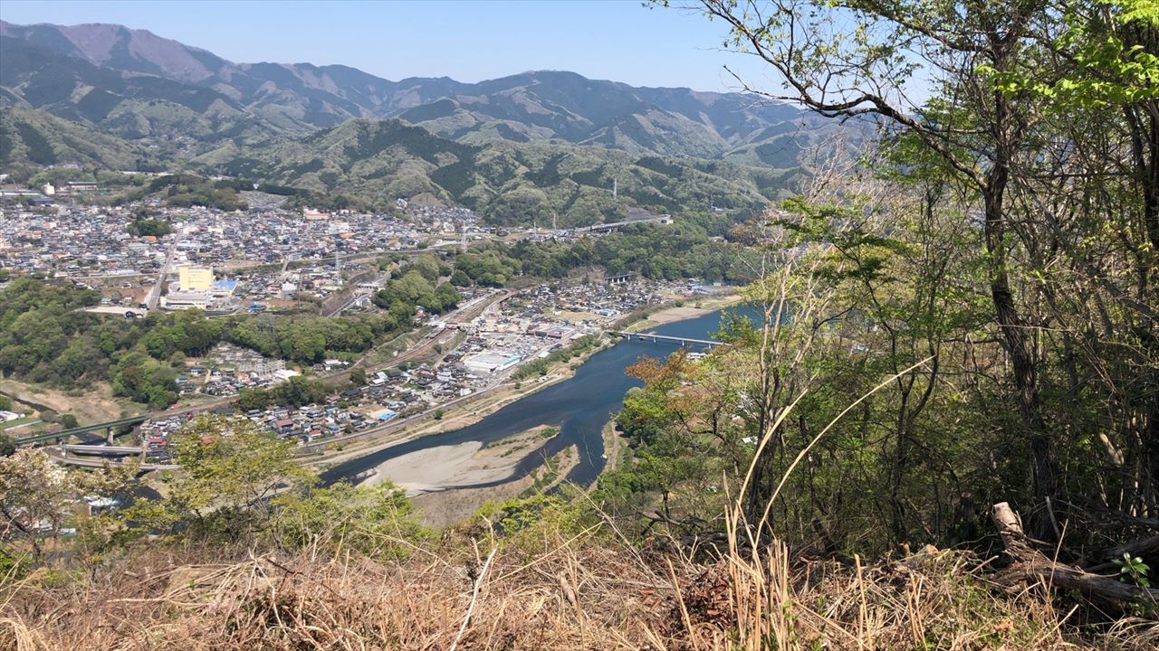 「鶴島御前山」から上野原駅を望む。 中央右側の「桂川橋」を渡って駅へ!