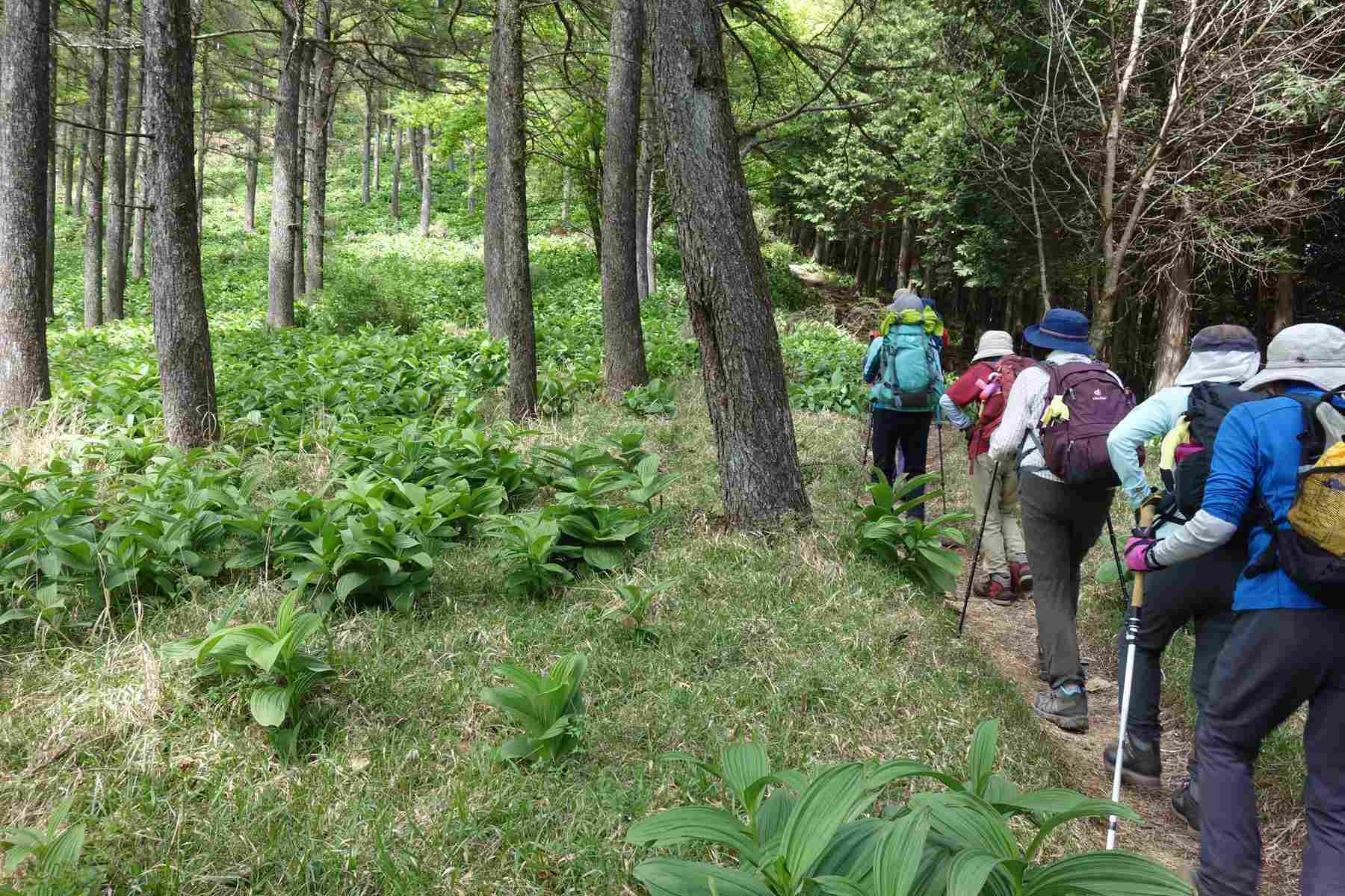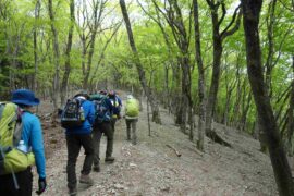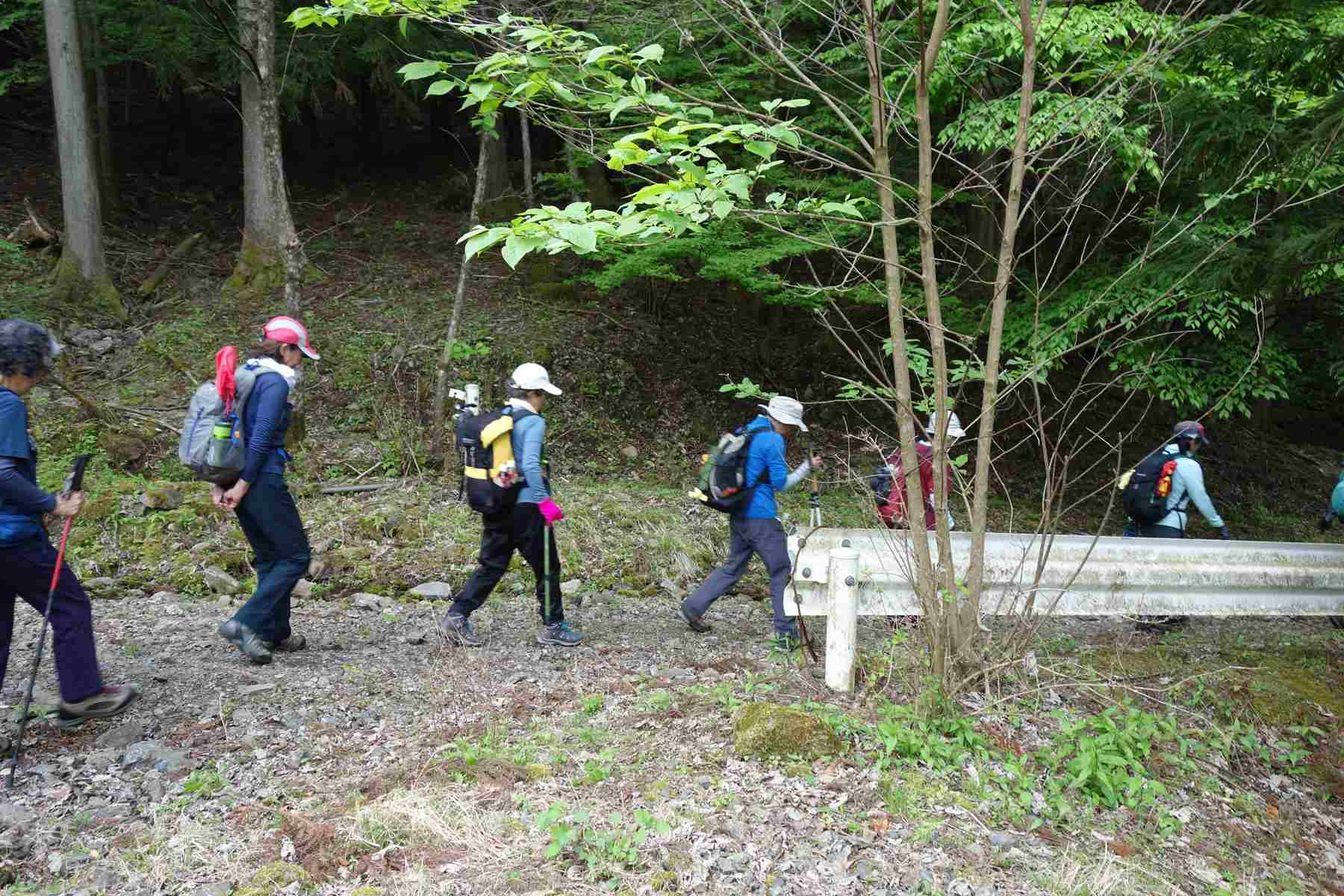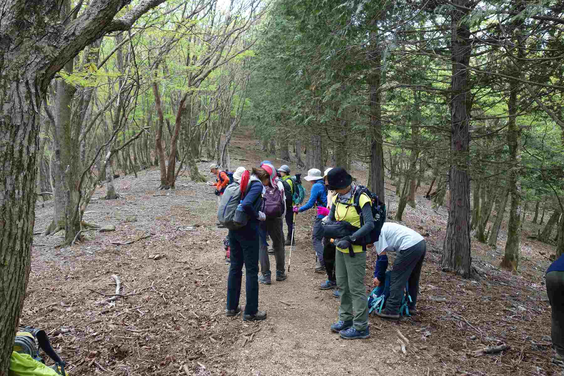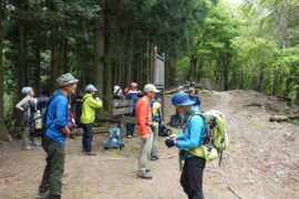 50台程車があふれていました。今日はロングコースなので、入念にストレッチ体操をし登山開始しました。妻坂峠~大持山までの急登をブナ林の新緑の力も借り、皆さん順調に登り切りました。