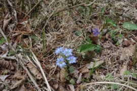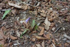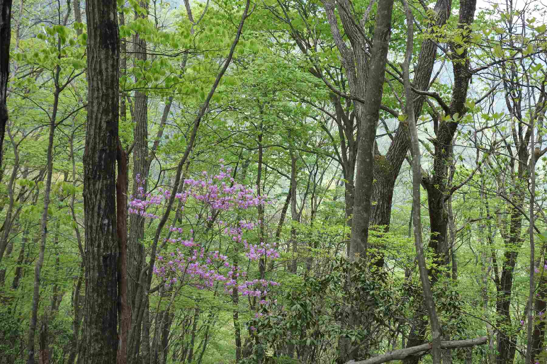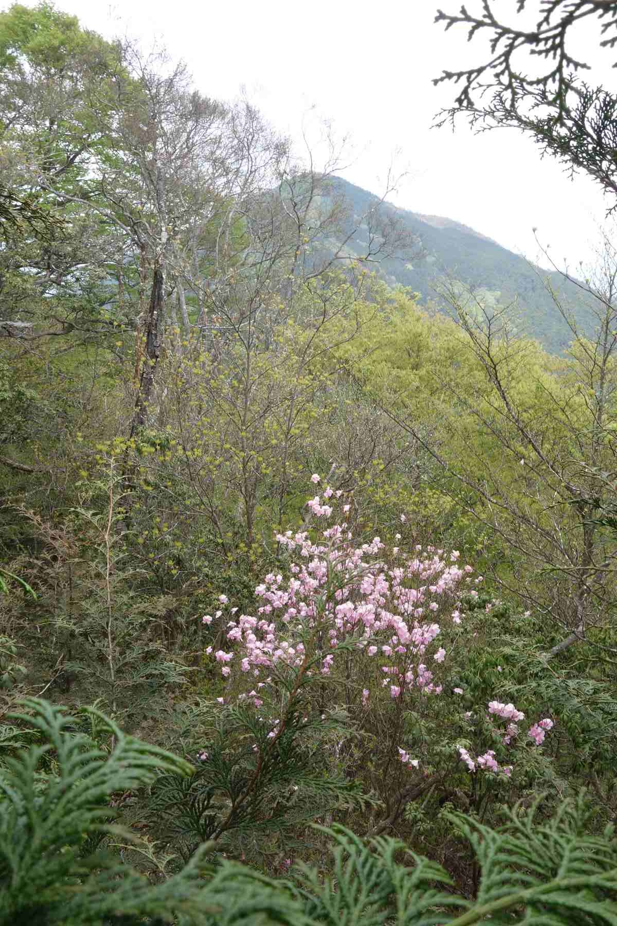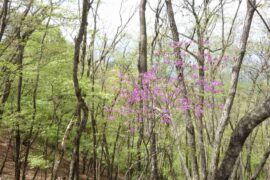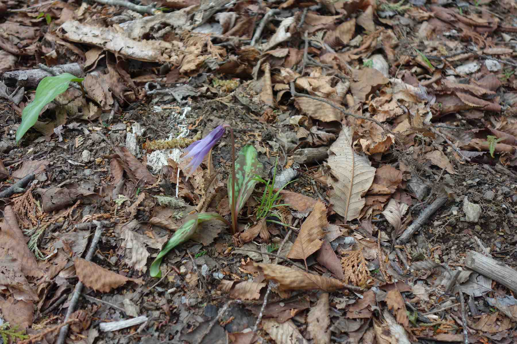 登山道脇に遅咲きのカタクリが時々咲いており、ミツバツツジにも目を楽しませてもらいました。
