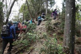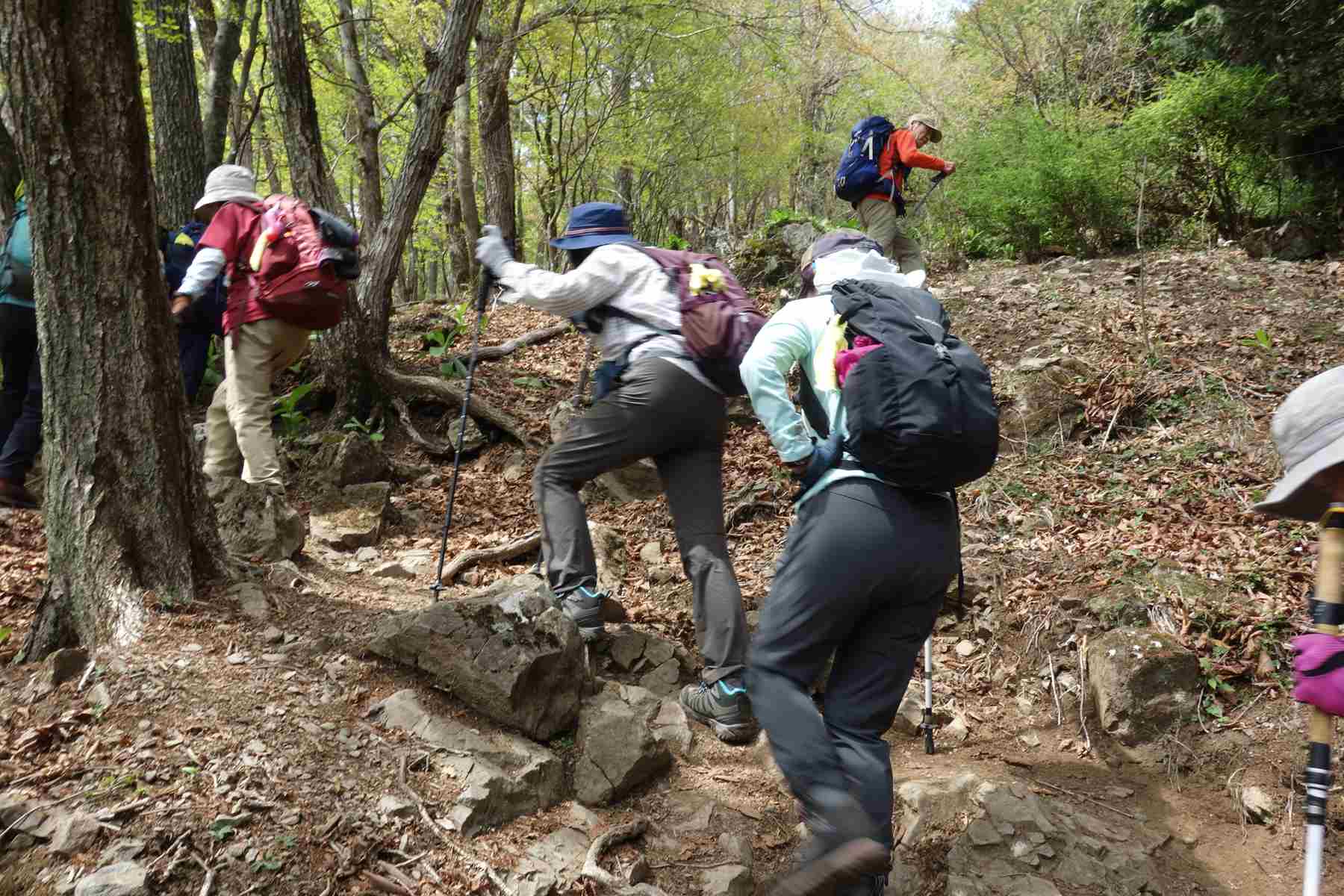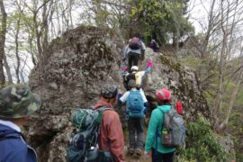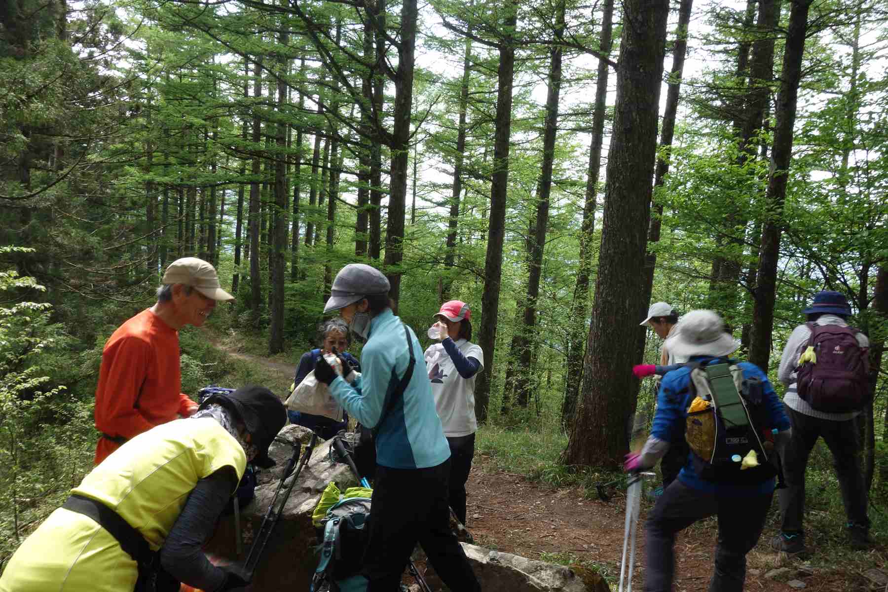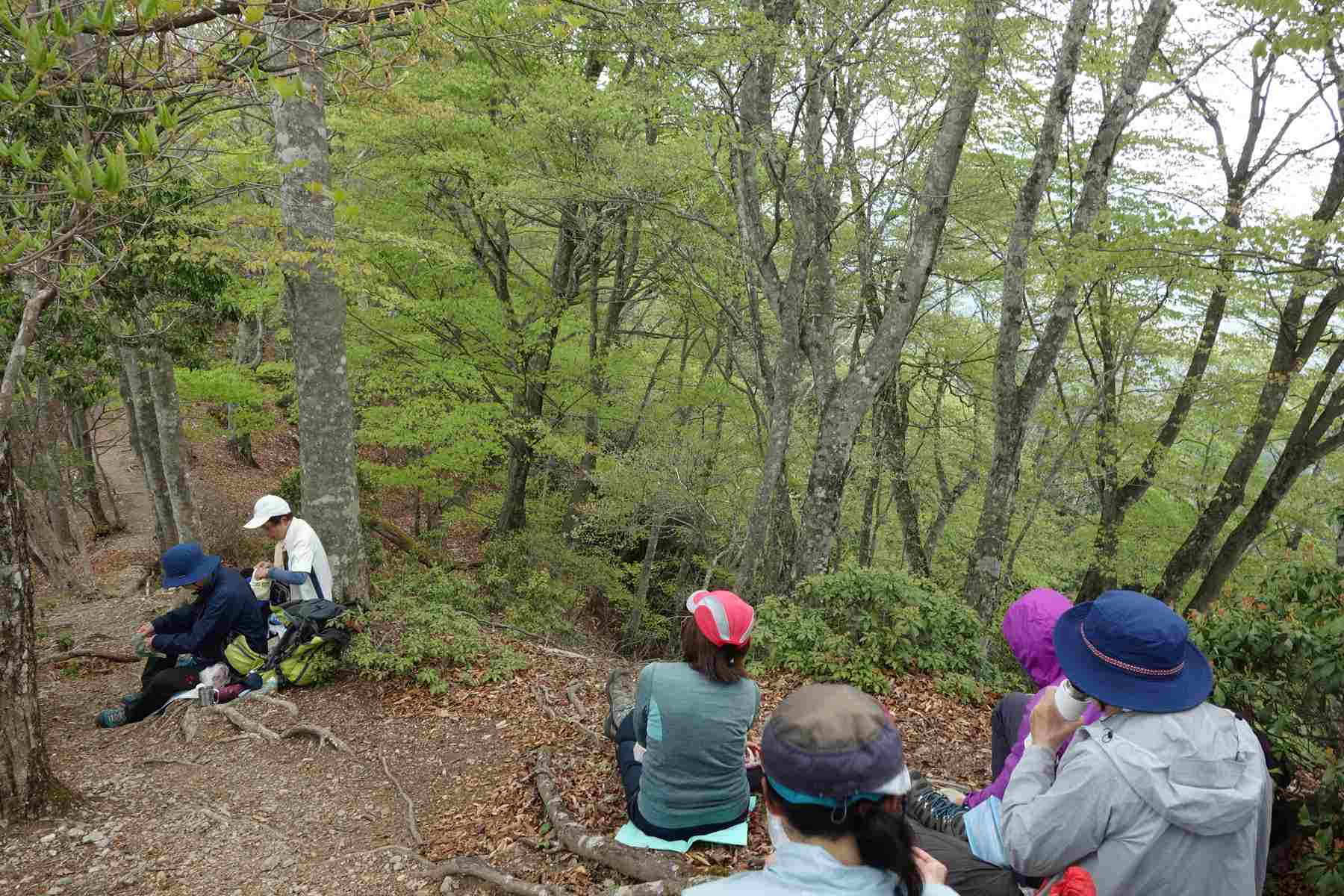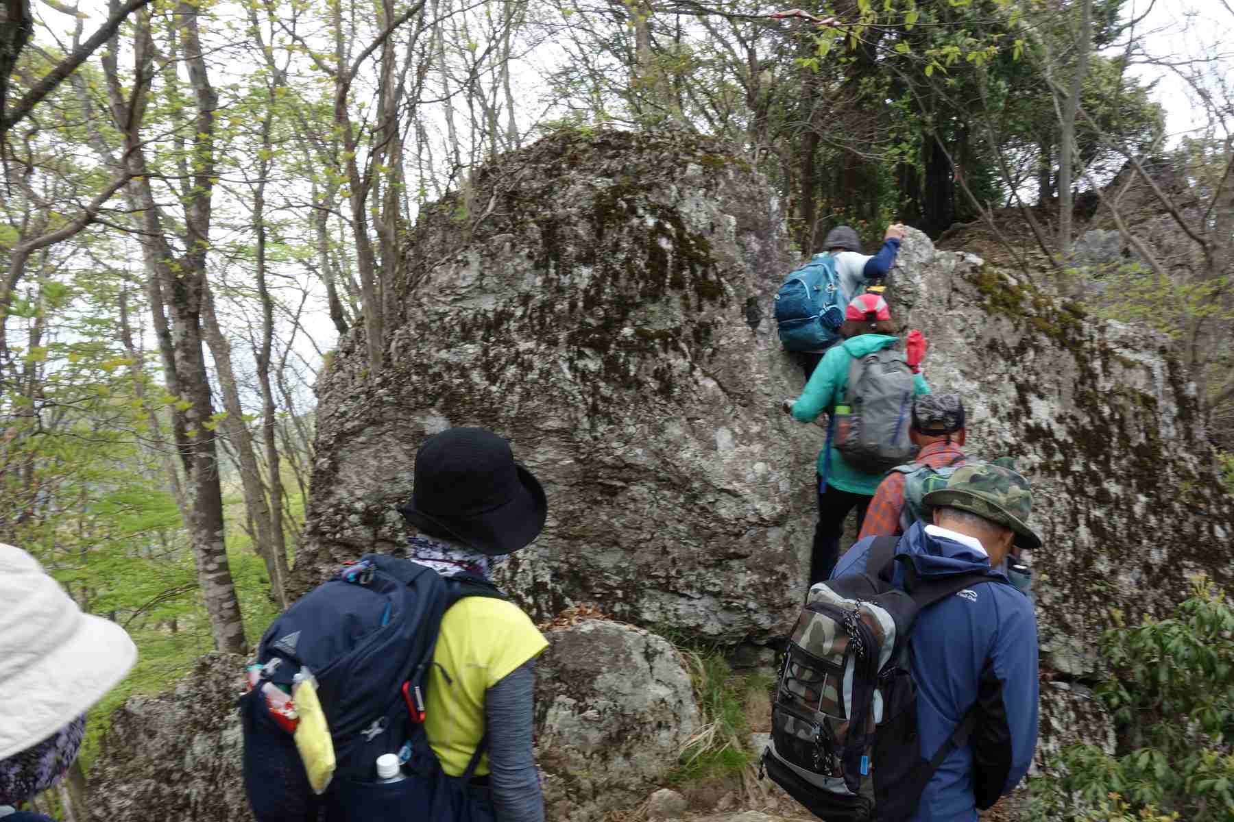 大持山で新緑の中昼食 岩場三点支持基本どうり登る