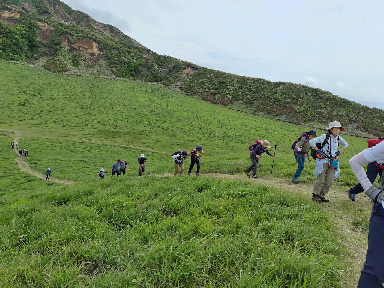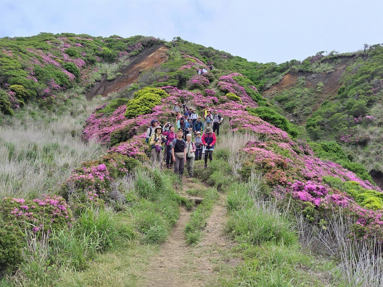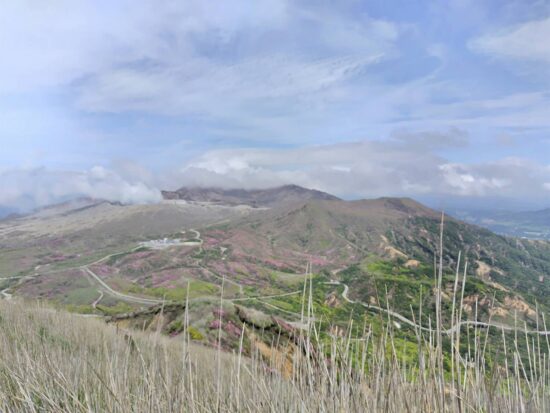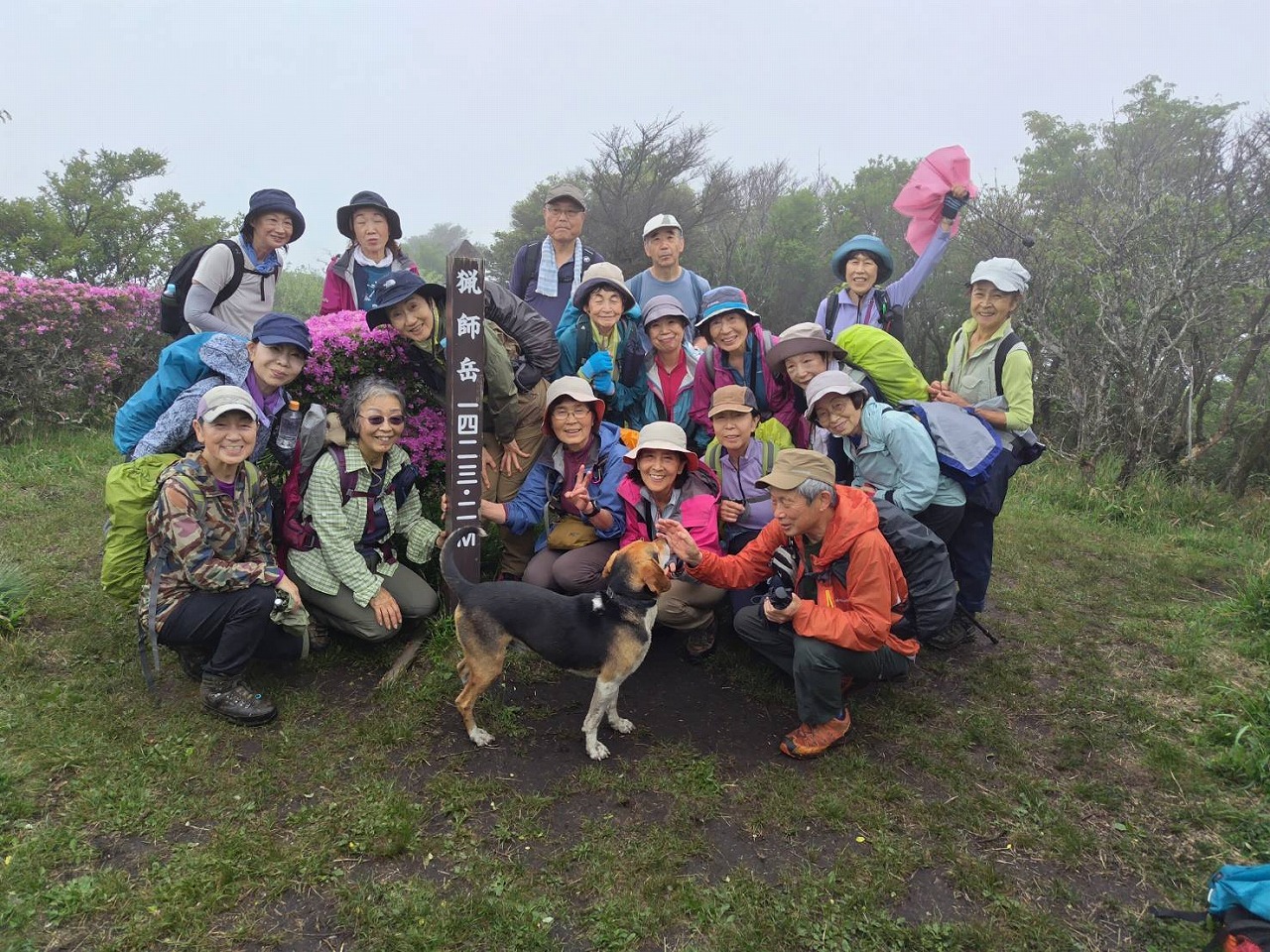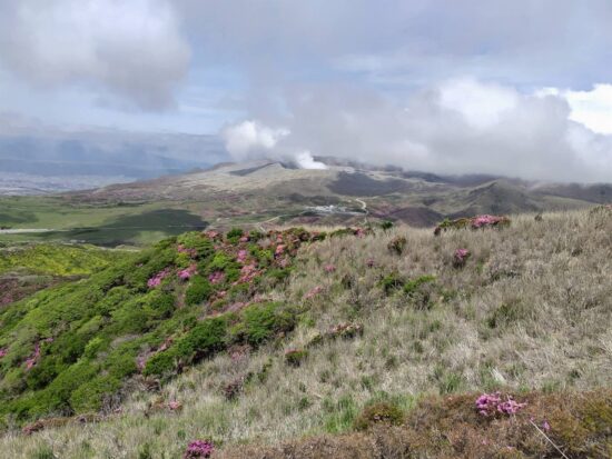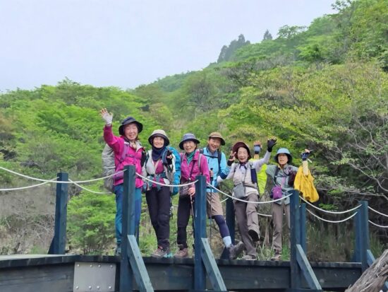 「この山行は去年お世話になったYHのご主人と久住の山々に魅了されて企画しました。移動手段が飛行機でしたのでどうなるか心配しつつ、でしたが。出発前に予想外のツツジへの虫被害を知らされ、現地で茶色になった木の上に群がる尺取虫に驚き、余儀なく山も変更の事態に。でもそれに変えた山やルートにちゃんとツツジが溢れるほど咲いていて、まさに久住は広し!でした。3日目の猟師山は宿のご主人がコツコツと整備されたコースで今年は満開のキリシマツツジのお出迎えです。のんびりと歩きます。毎日みんなと山を歩いて温泉に入り、宿でお喋りを楽しみました。こんな山歩きをしてみたいと企画した時からの思いが叶い、改めてお世話して下さったオーナーご夫妻とご主人の友人の方々、愛犬の“こうちゃん”参加会員の皆様に感謝致します。」
