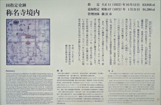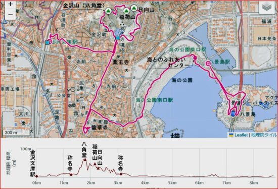 京急線金沢文庫駅9:05→称名寺9:40→八角堂(金沢山)10:05→稲荷山10:15→称名寺仁王門10:55→薬王寺11:00→龍華寺11:25→11:40海の公園→海とのふれあいセンター