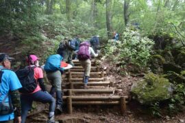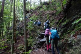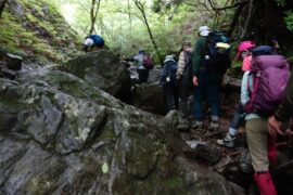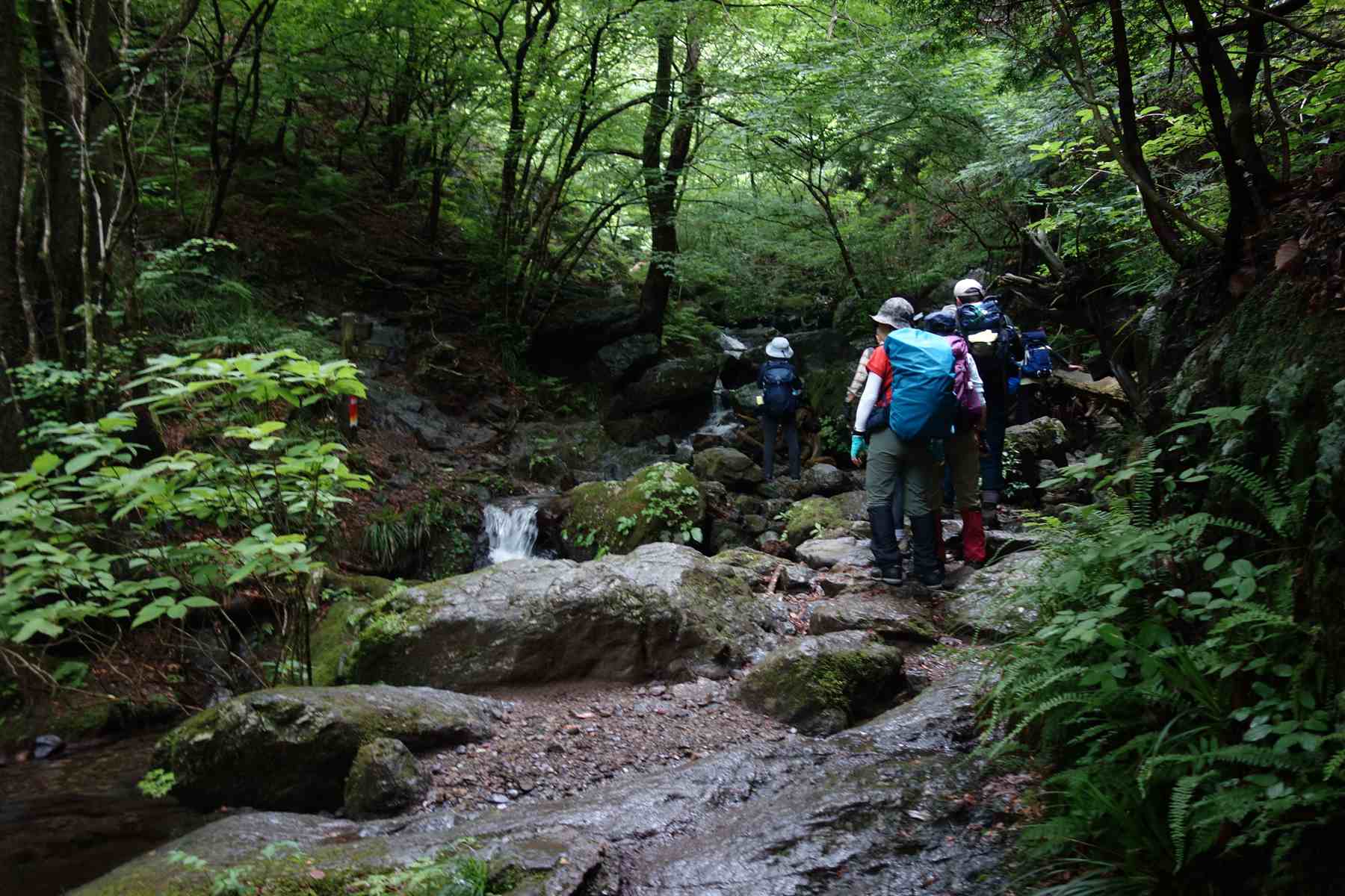 リーダーコメント:関東地方も梅雨入りし、雨の日が続いている中、沢登は心配ではありましたが、沢に下りてみるとわずかな増水のみで一安心。皆さん濡れた岩に注意しながらマイナスイオンが一杯最高に気持ちいいと、渡渉を楽しみながら歩きました。帰りは木の根の露出した急降下をリズム良く、怪我無く無事下山しました。参加L、参加協力者の皆さんありがとうございました。参加された会員の皆様ご協力ありがとうございました。 星富士夫