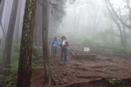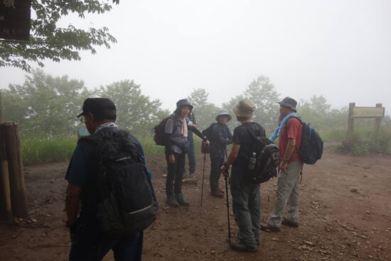 濃い霧の中下山です 岩茸石の手前に立派なベンチがあります