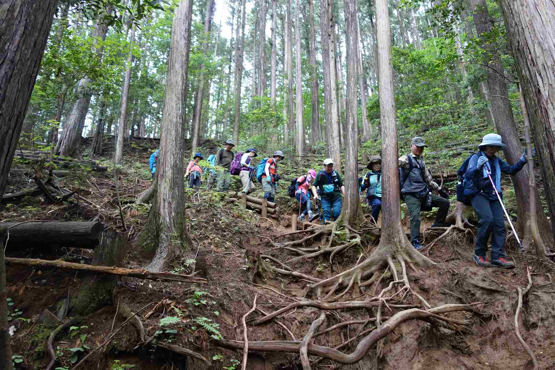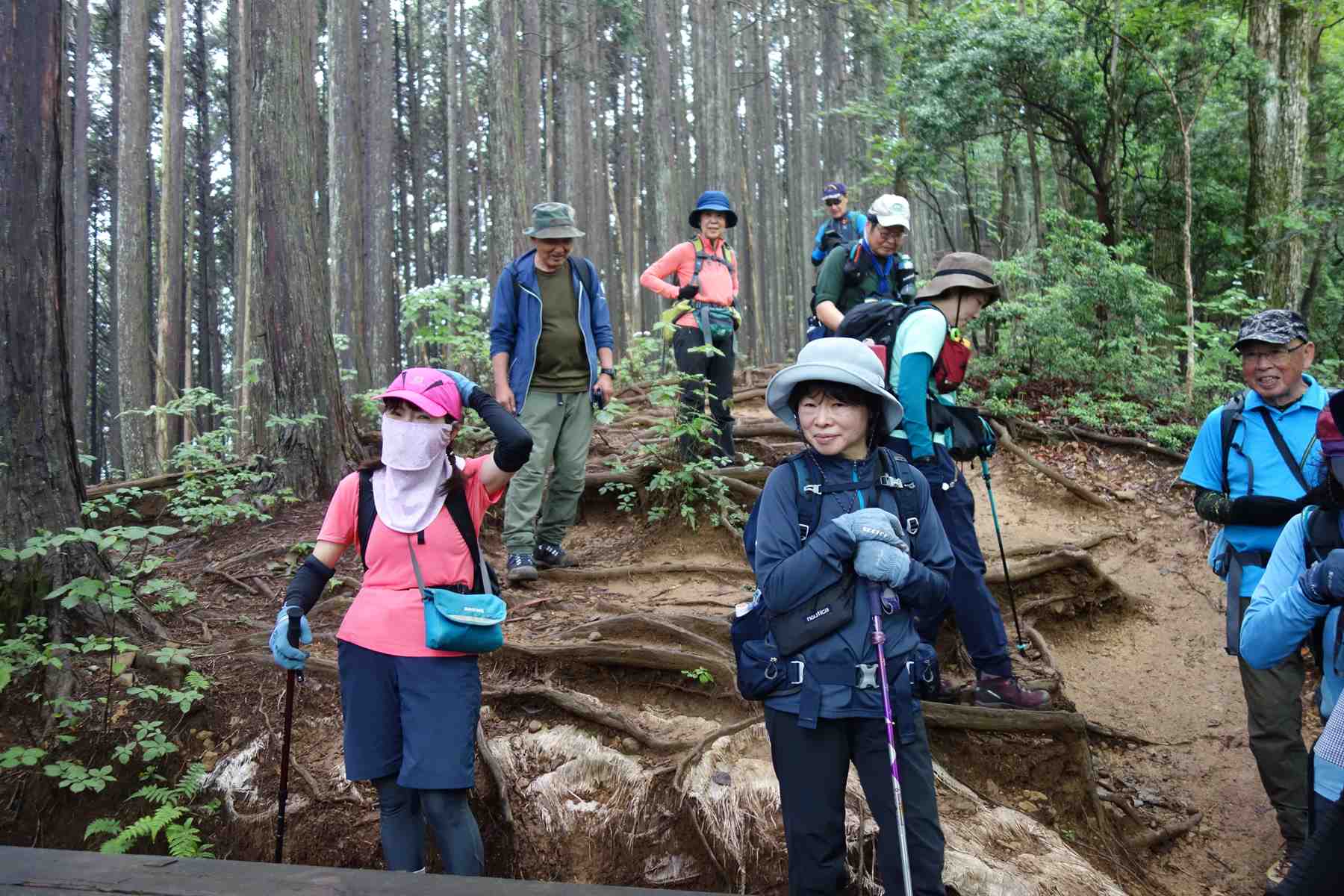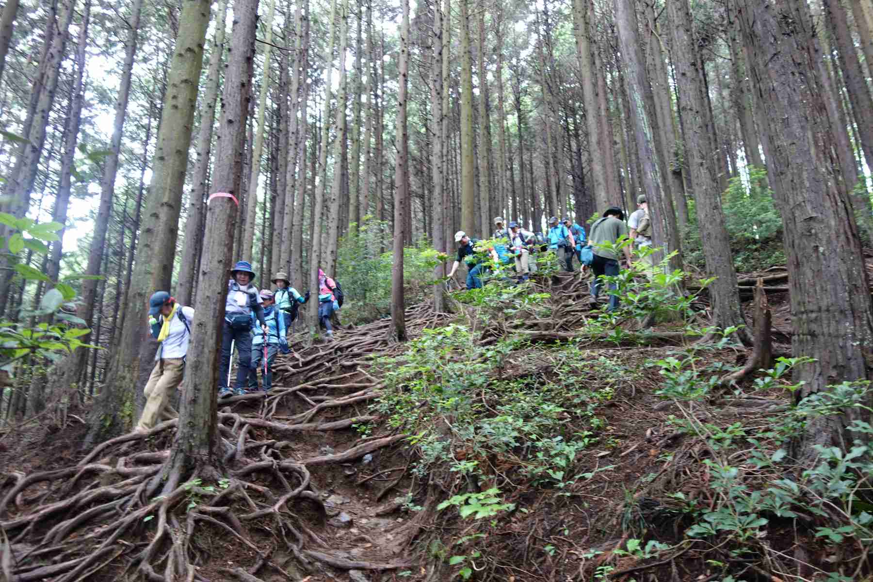 木の根もこう見ると芸術的です 下山途中何か見つけたのか注目してます
