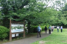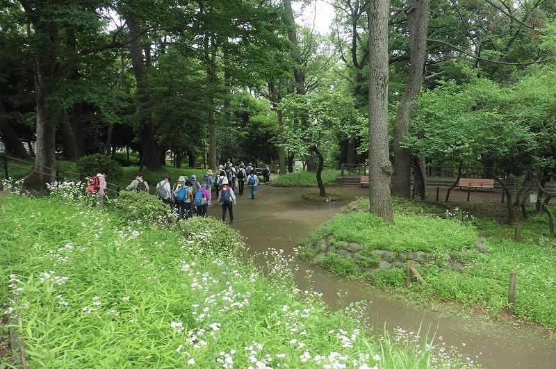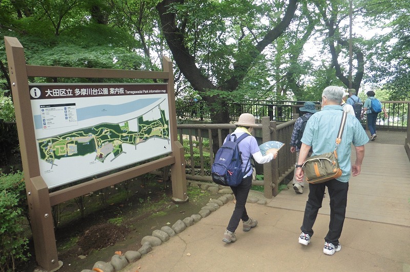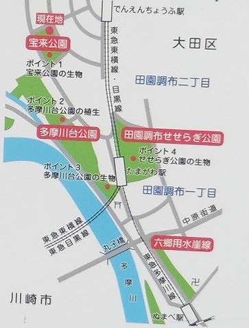 東急東横線田園調布駅(10:30)→宝来公園→多摩川台公園(10:55)→田園調布せせらぎ公園(12:00~13:00)昼食→六郷用水(13:05)→鵜の木公園(13:36)解散挨拶→東急多摩川線鵜の木駅