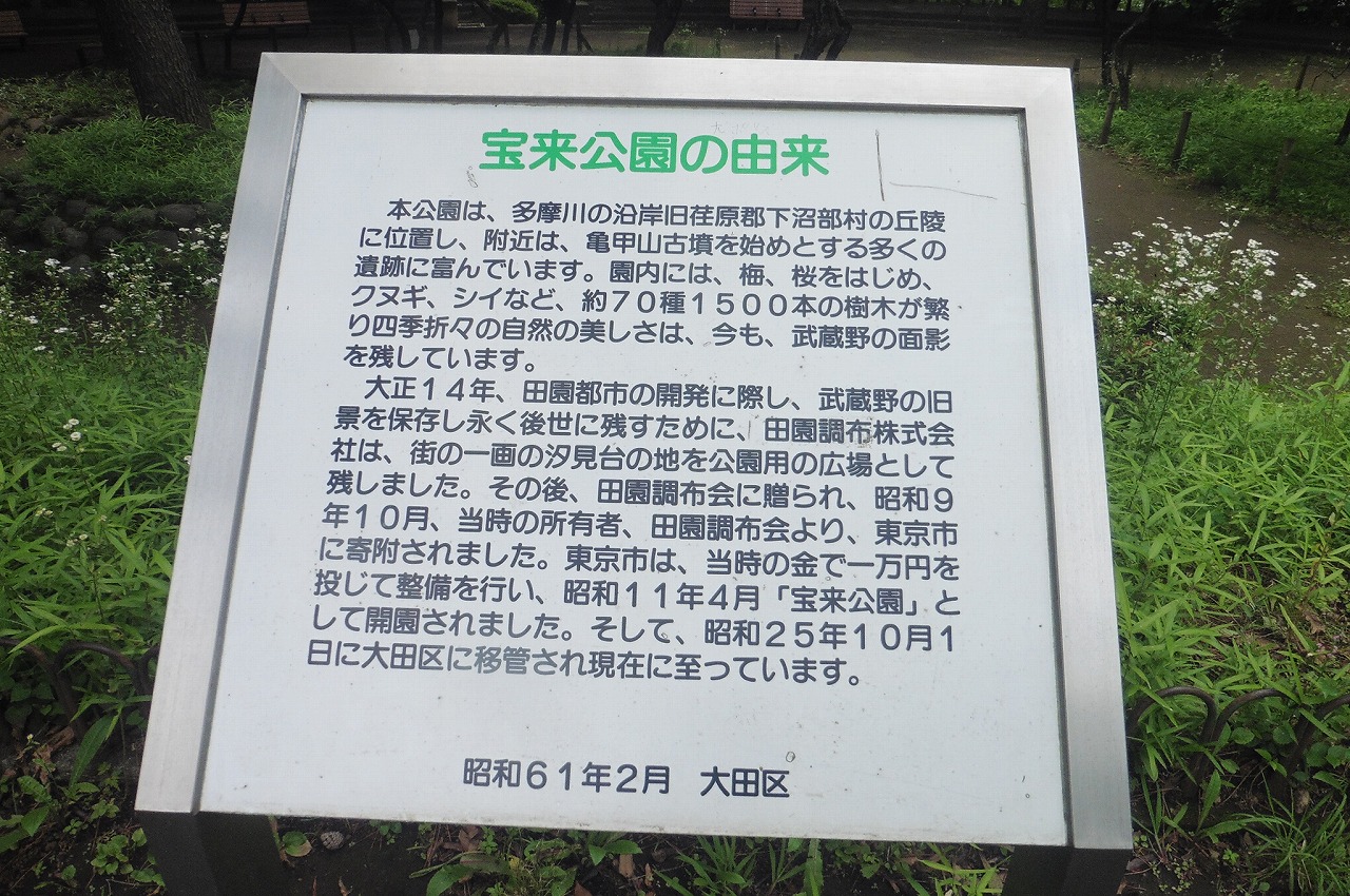 多摩川台公園の亀甲山古墳は国指定史跡、宝来山古墳、多摩川台古墳は東京都指定史跡となっています。 なかでも亀甲山古墳は、ほぼ完全な姿を残す前方後円墳として有名です。