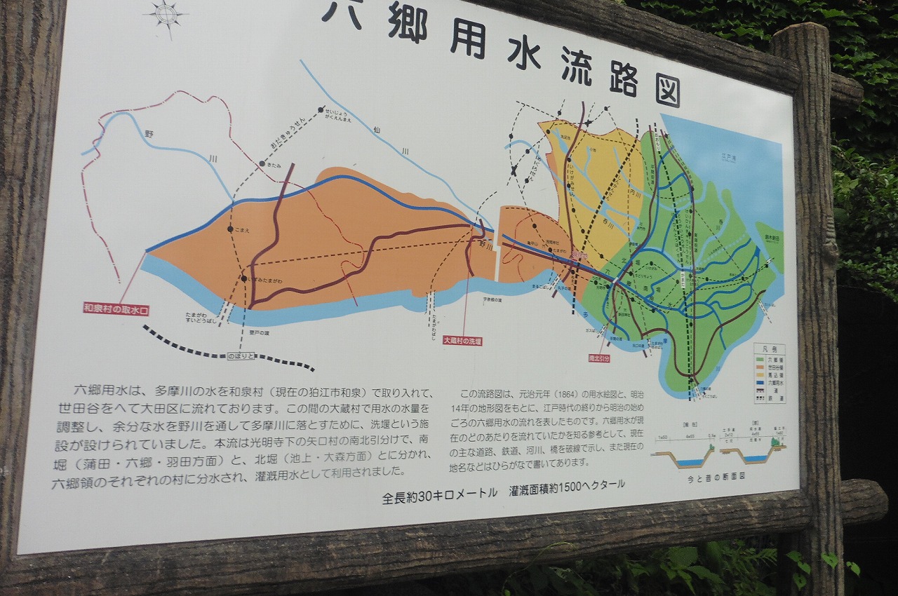 六郷用水 江戸時代に築かれ、多摩川を水源に、北多摩郡和泉村(狛江市)から世田谷領(現・世田谷区)を経て六郷領(現・大田区)へと流れる用水が六郷用水。用水としての機能は昭和20年に終えていますが、大田区田園調布の丸子橋近く(田園調布本町34)から下流部(鵜の木3丁目2番)には六郷用水遊歩道が整備されています。