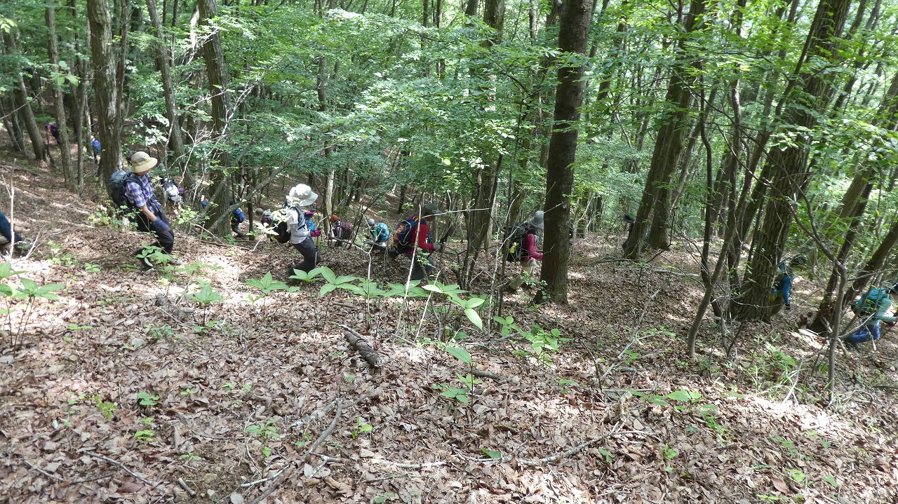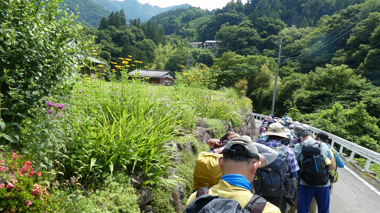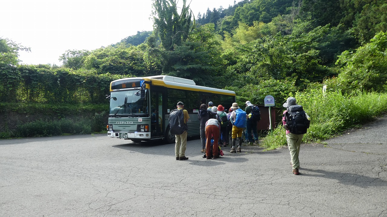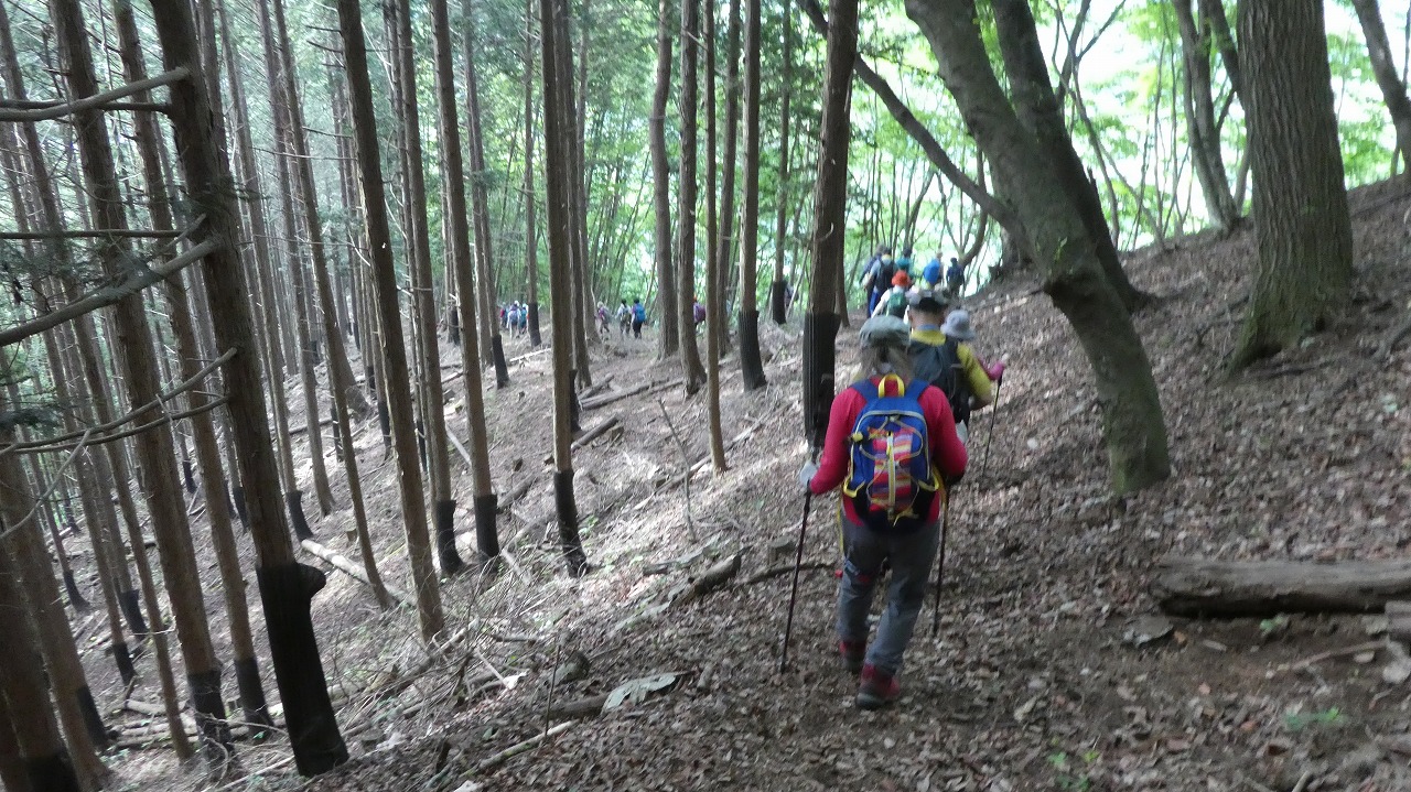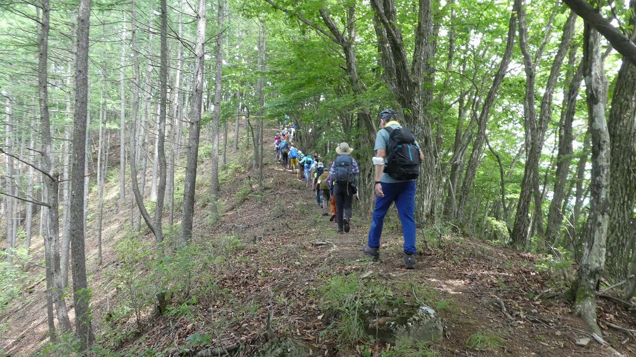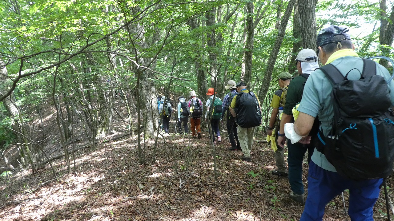 「暑い一日が始まり常に熱中症が頭に浮かぶ状況の中の山歩きでしたが、殆ど緑の下で救われました。権現山までは917m登って、下りは717m、行程中の登る割合が高!のルートですが、皆様坦々と歩き通して下山後はタクシー利用の所をバス会社の好対応による増発便指定時間内に下山できました。一同大盛り上がり!です。