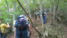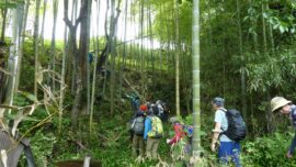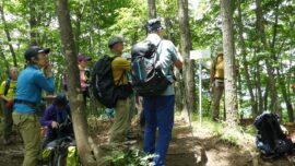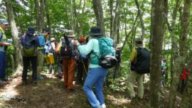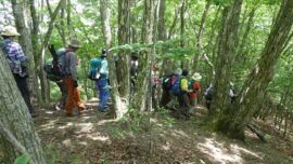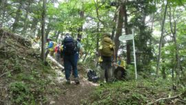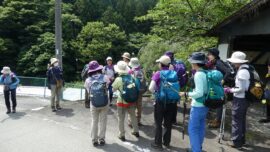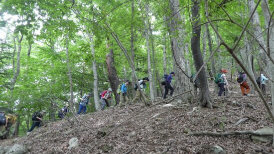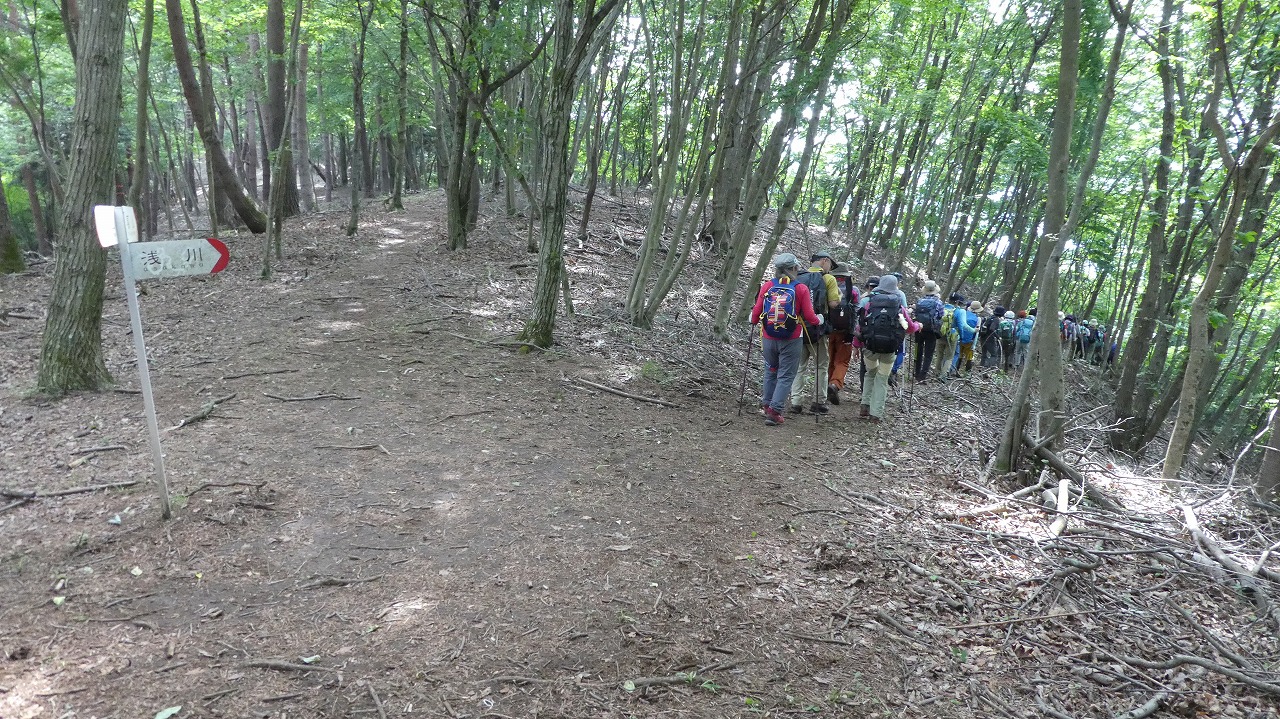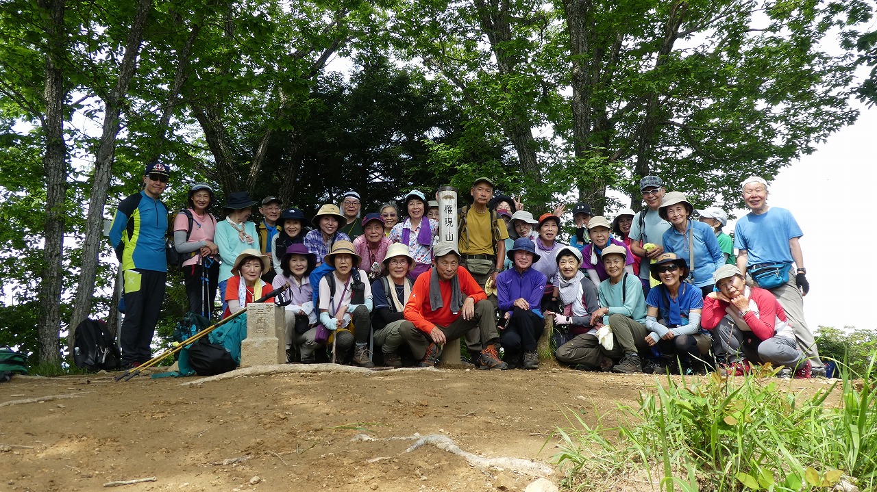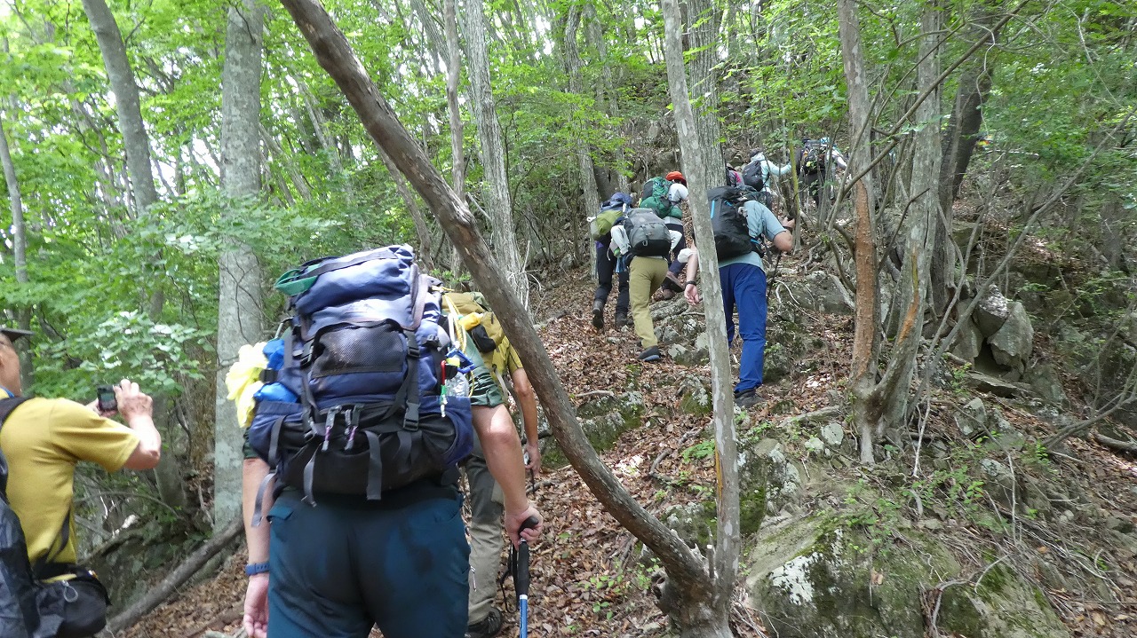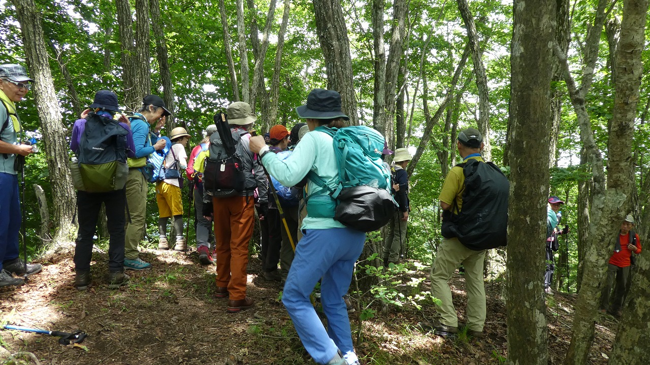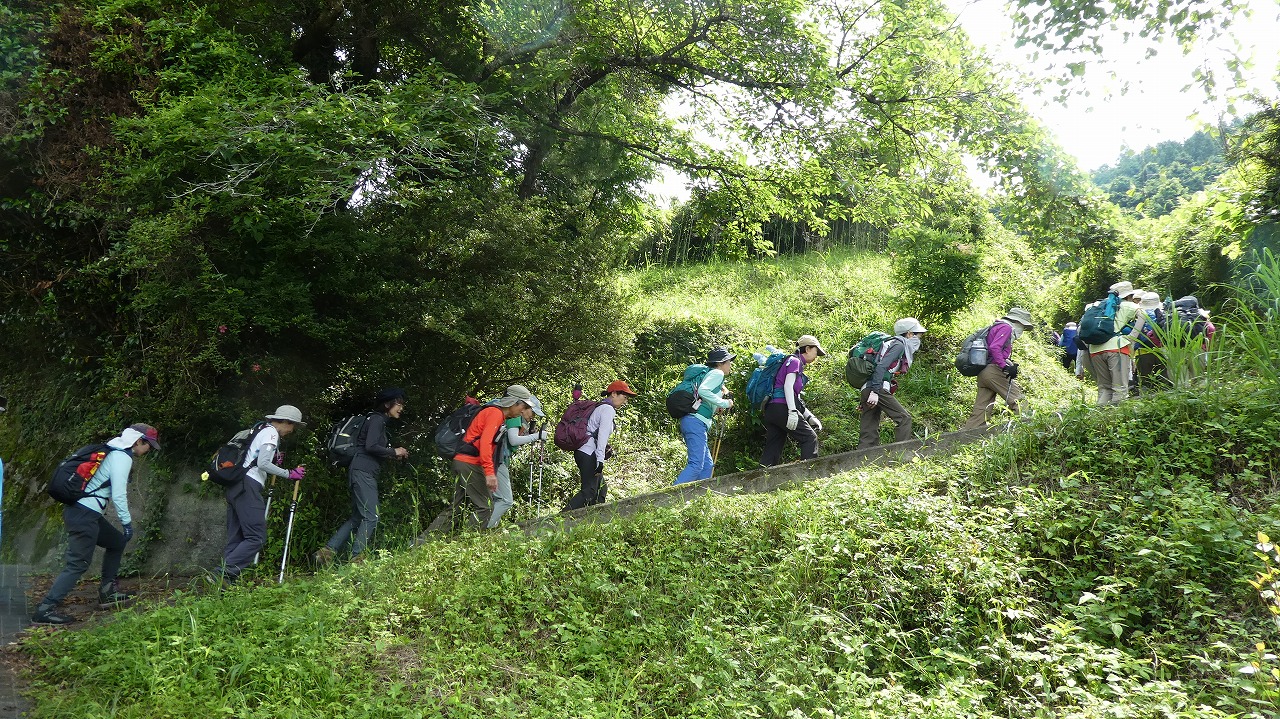 「暑い一日が始まり常に熱中症が頭に浮かぶ状況の中の山歩きでしたが、殆ど緑の下で救われました。権現山までは917m登って、下りは717m、行程中の登る割合が高!のルートですが、皆様坦々と歩き通して下山後はタクシー利用の所をバス会社の好対応による増発便指定時間内に下山できました。一同大盛り上がり!です。