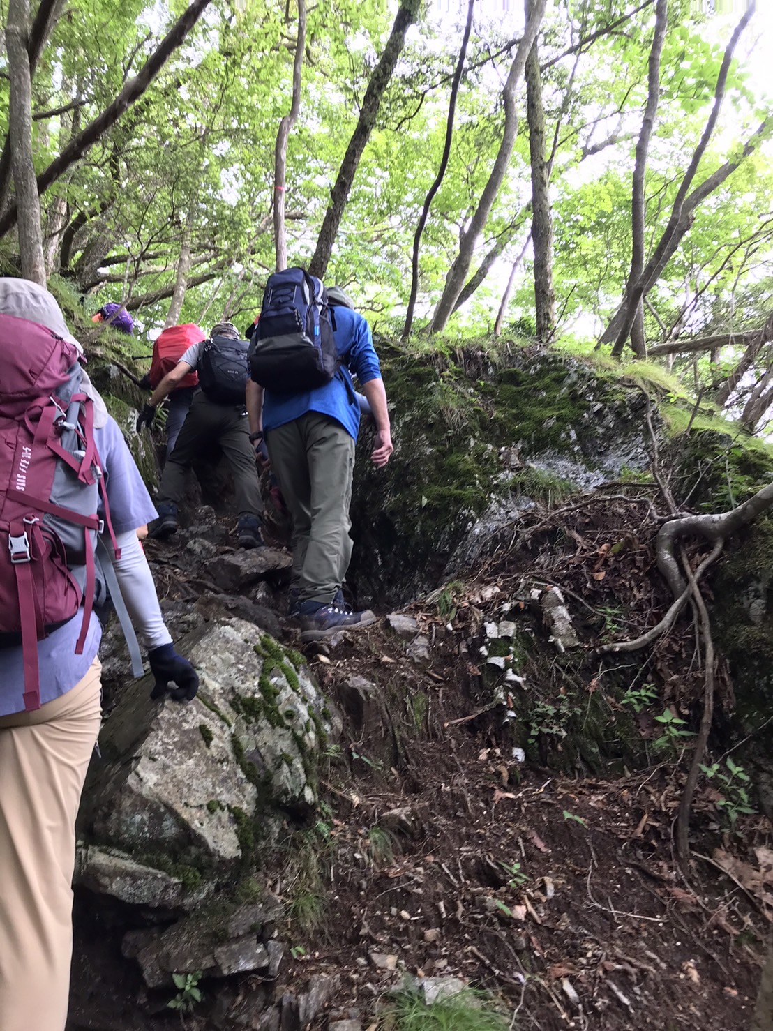 梅雨の合間の晴れでしたが、湿度が高く、「屈曲点」までの登りは蒸し暑い中での山行になりました。「蕨山」に近付き、標高が1,000m近くになるとようやく、ヒンヤリした空気に触れることが出来て、一息!