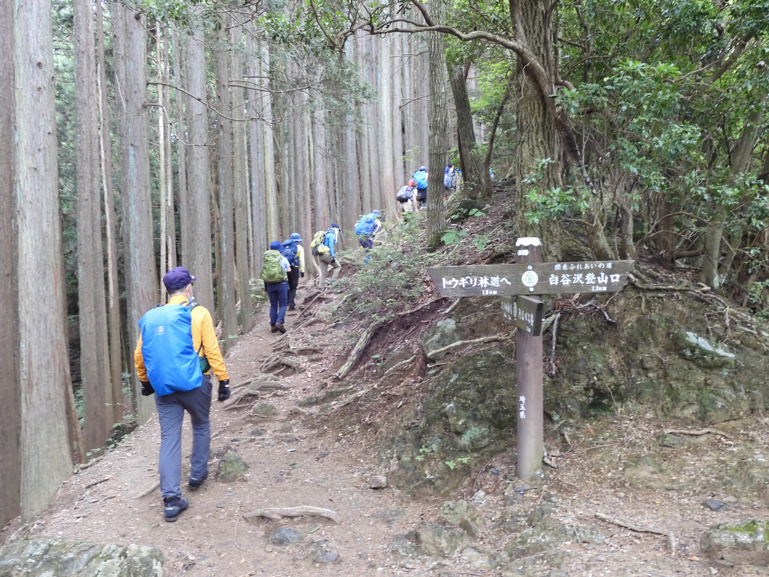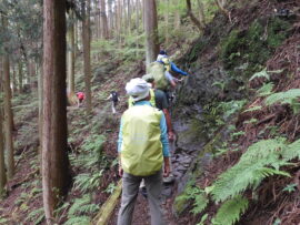 「水源の道」を進む 鬱蒼とした杉林の中足元がぬかるんで悪条件の中慎重に