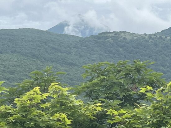 雄国山への登る途中 雲に隠れていた磐梯山が徐々に顔を覗かせくれる