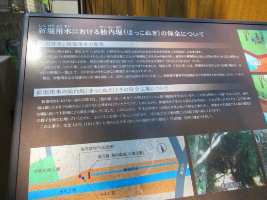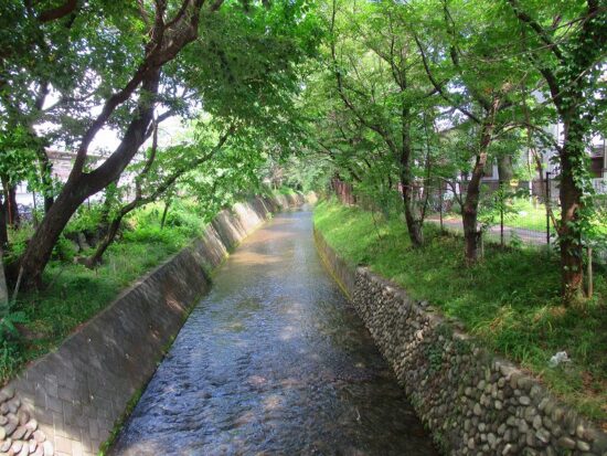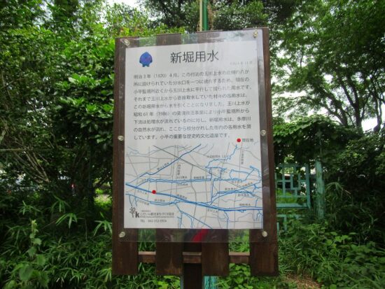 玉川上水完成後、用水を掘り、各地に水を行き巡らせて各家や農地で活用しました。玉川上水と平行に新堀用水が流れています。