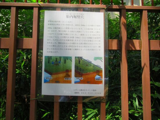 胎内堀の説明 竪穴を掘り、両脇からトンネルを掘り、竪穴から竪穴をつなぎ地下水路を作りました。