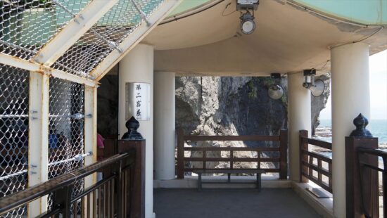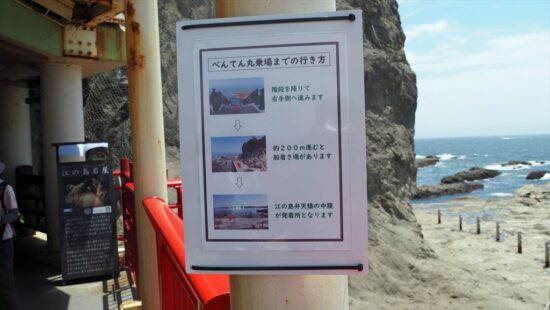 江の島岩屋入口。べんてん丸乗場までの行き方の看板も。