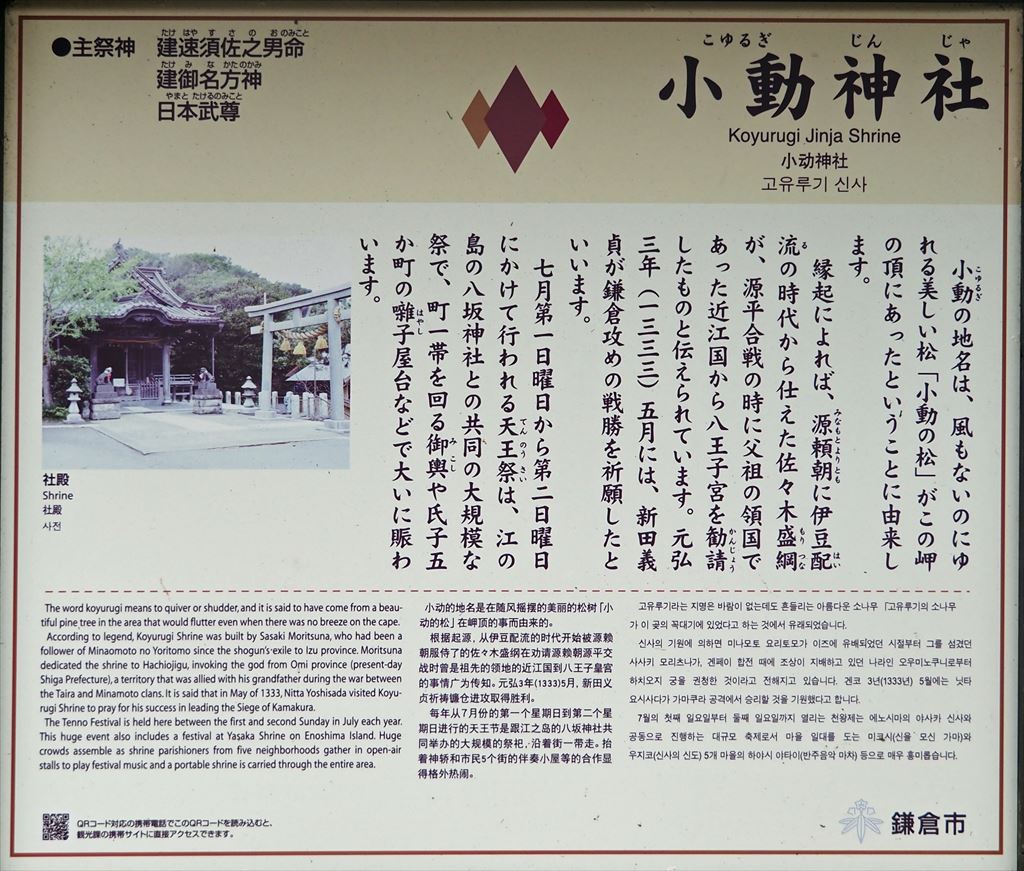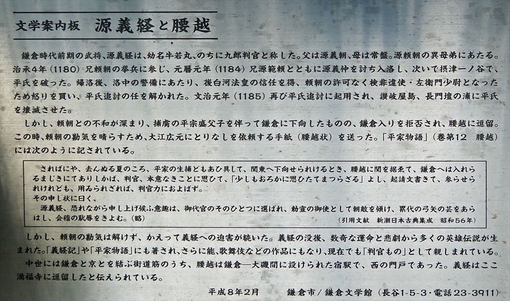 元暦2年(1185年)5月、源義経が兄頼朝に怒りを買い、鎌倉入りを許されず腰越の地に留められた際に、頼朝に心情を訴える腰越状を書いた寺として知られる 。寺には弁慶が書いた腰越状の下書きとされる書状が展示されており、境内には弁慶の腰掛け石や手玉石など、義経・弁慶ゆかりの品々が多数展示されている。。(出典・参考:wikipedia)