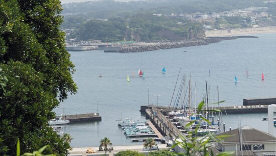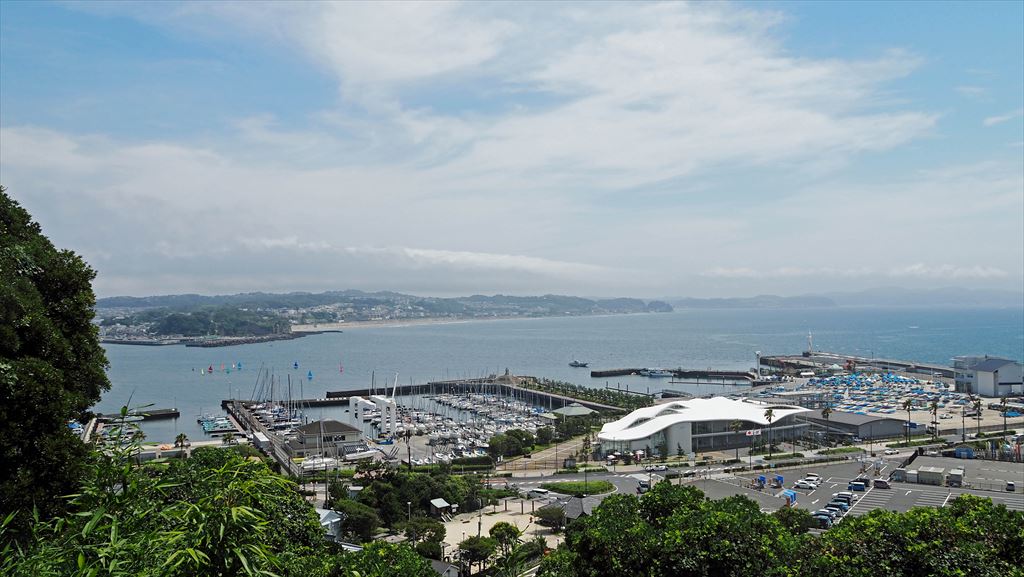 眼下に江の島ヨットハーバーと対岸には小動岬、その右には七里ヶ浜と稲村ヶ崎が見える。
