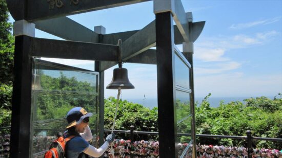 この鐘は、江島縁起「天女と五頭龍伝説」の恋物語にちなんで建てられたもので、その伝説にあやかり、老若男女、多くの人が鐘を鳴らしに訪れます。