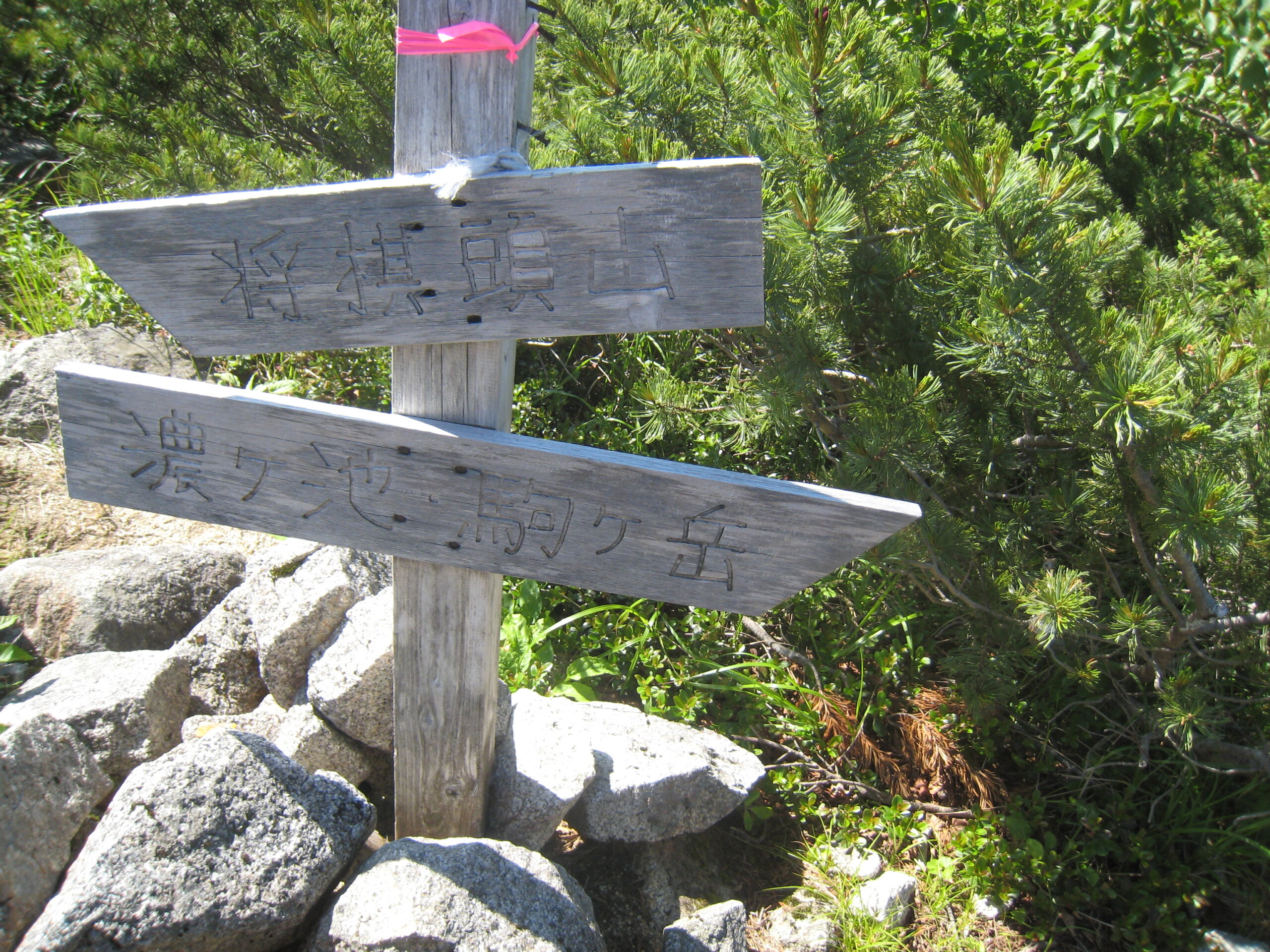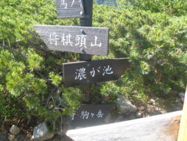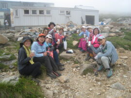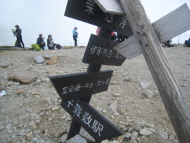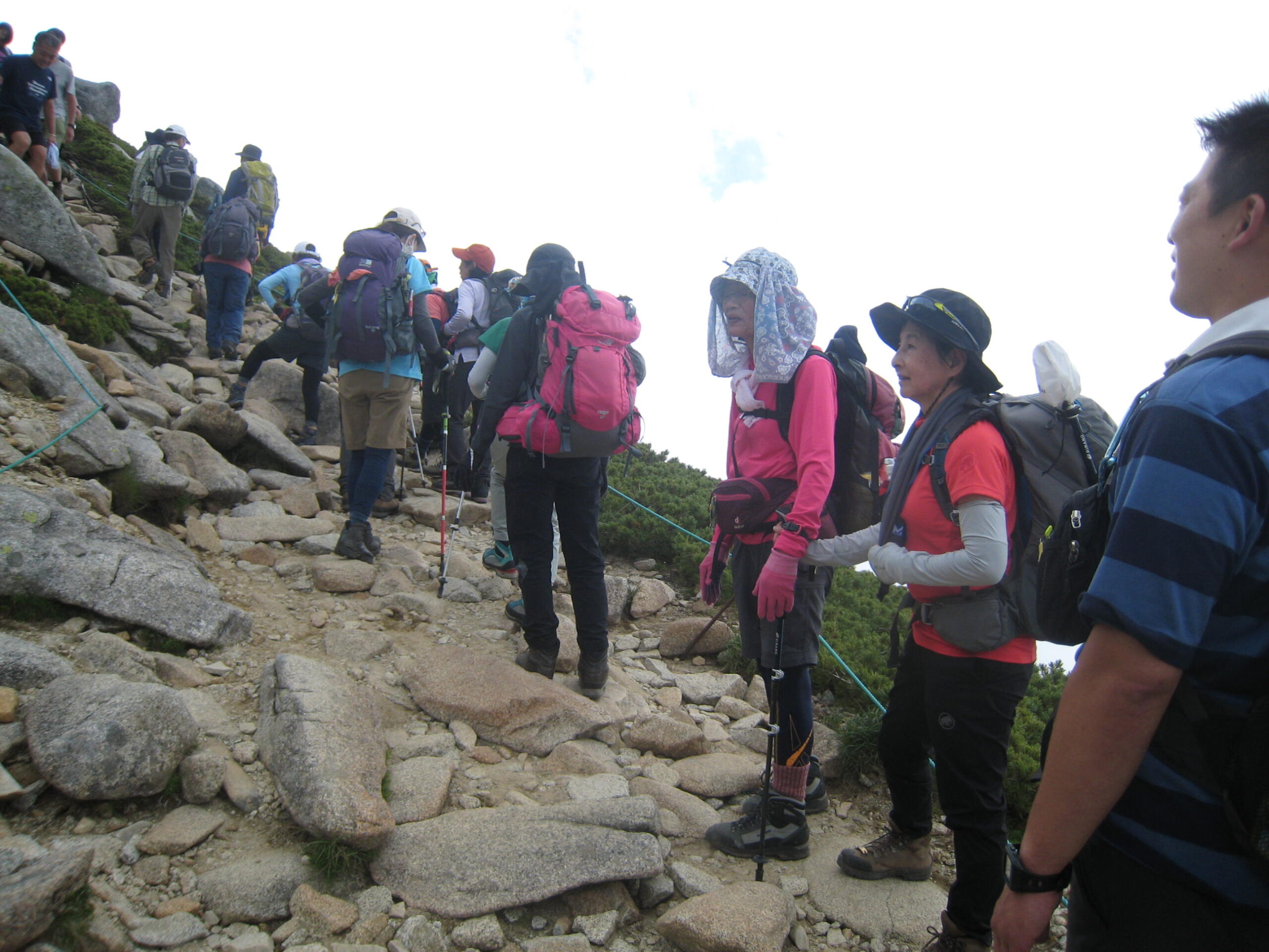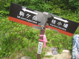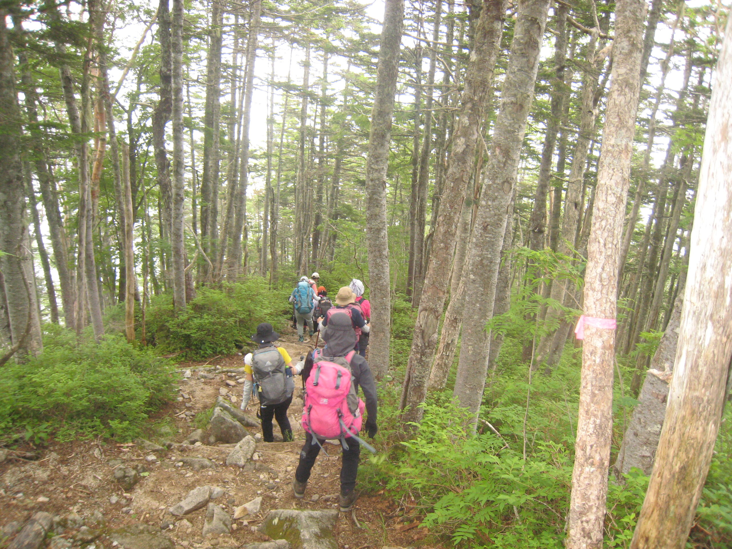 もうお花は終わってしまいました。例年より3週間早いです」と言うお話しでした。初めての参加者に素晴らしいお花畑見て欲しかったけど残念❕ 駒ケ岳から八合目までは岩場が続き桂小場まで長い長い降りでしたが稜線からは御岳山、乗鞍岳東に甲斐駒ケ岳をはじめ南アルプスの山々と富士山が遠望出来ました。