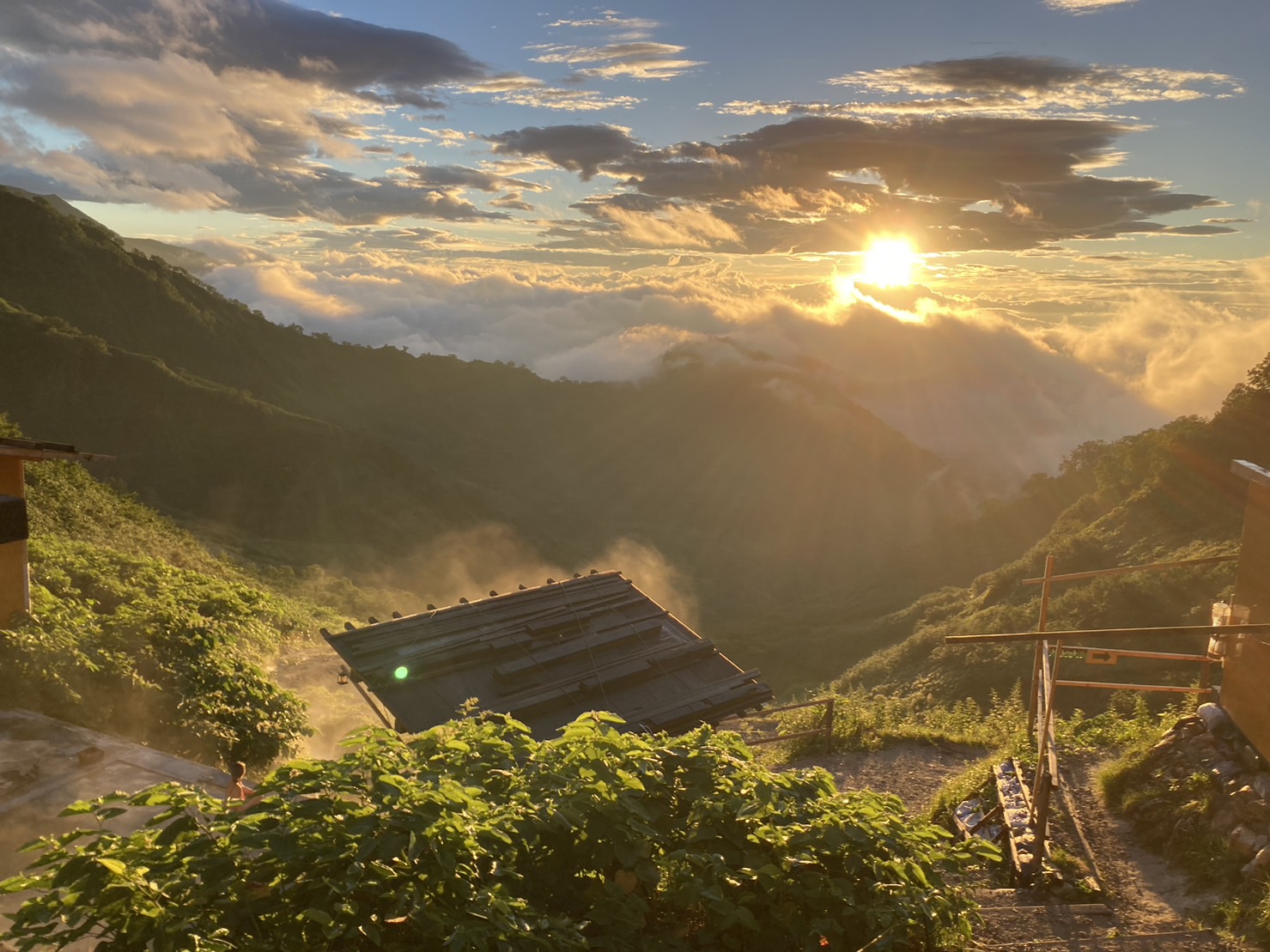 夕焼けに染まった「雲上の露天風呂」標高は2100m。冬季は雪崩を避けるため、毎年6月に小屋を組み立て、10月に解体されるというなかなか手のかかる山小屋です。ここでしか味わえない露天風呂でした。