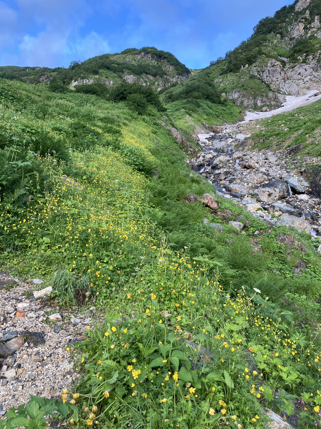 振り返って「鑓温泉」方面。雪の少なさがわかります。黄色い花々ともお別れです。