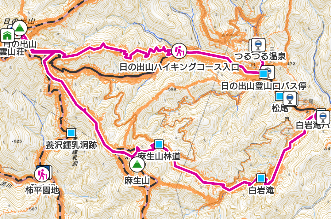 麻生平9:55-10:18麻生山10:30ー11:27日の出山(昼食)12:08ー13:42つるつる温泉