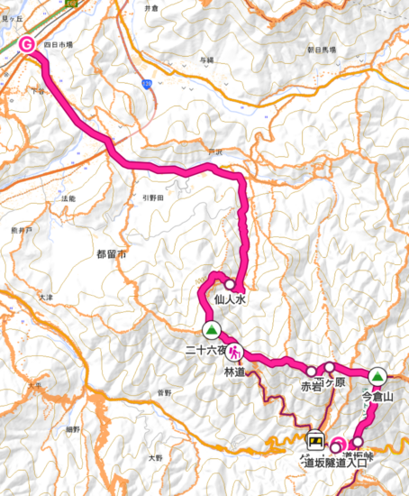 コース :都留市駅8:15-(バス)ー8:45道坂隧道8:55ー9:08道坂峠9:17ー10:18