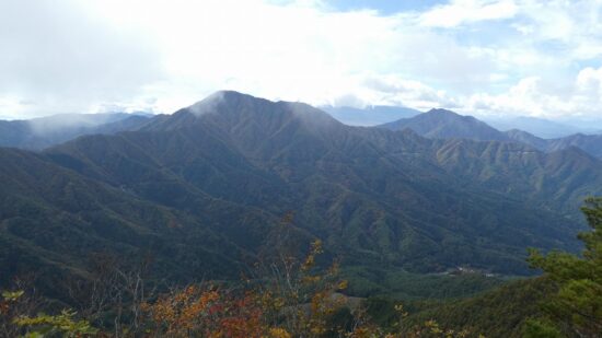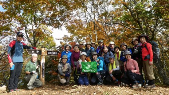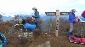 「本日の山は江戸時代の旧暦1月と7月の26日に出る二十六夜の三日月を待つ行事が由来の二十六夜山。まずは今倉山から登り赤岩へ。富士山は雲を被っていたが正に360度の大パノラマの広がりである。狭い頂上でのランチは眼下の大展望と差し入れの果物と飛び交うみんなのお喋りが漏れて、なんとも幸せ! 赤岩の下りからは紅葉も優しく始まって陽に輝きこちらも幸せな気分になった。