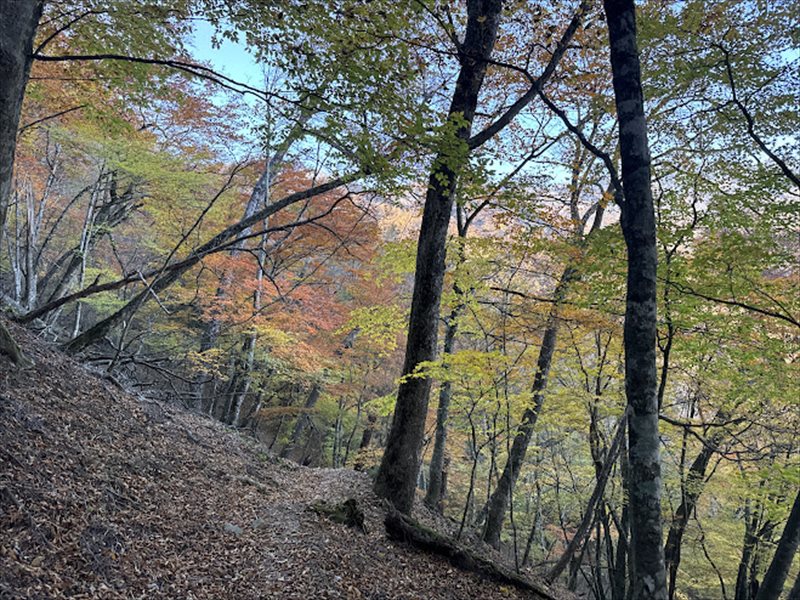 丹波天平からサオラ峠までの道、どこまでも続いていそうな感じのする道でした。素晴らしい紅葉の中を歩くことができました。