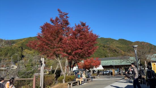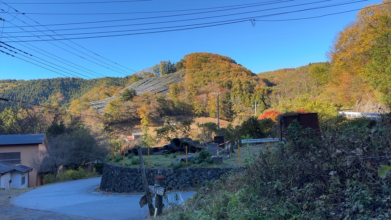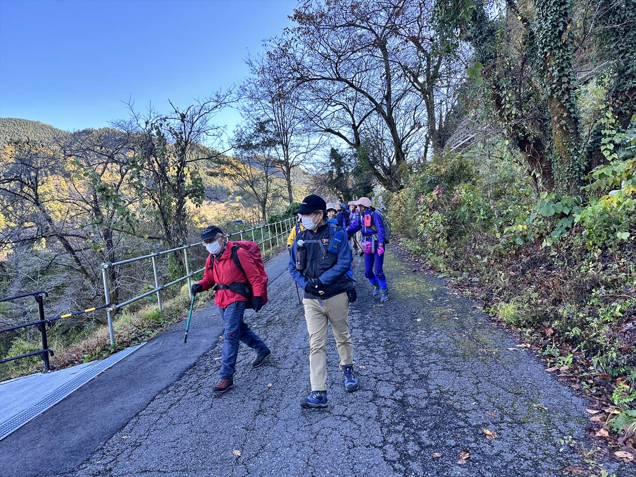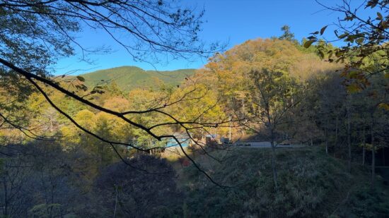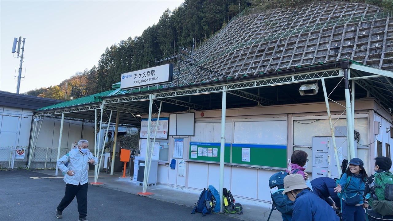 朝の芦ヶ久保駅前から見た景色は真っ青な青空の見事な秋晴れでした。ところが登山道を登っても暖かな日差しを浴びることなく、ほとんどが日陰の林道で気温は10℃前後。雄岳でのお昼も日の当たる場所を探すのに苦労する始末でした。